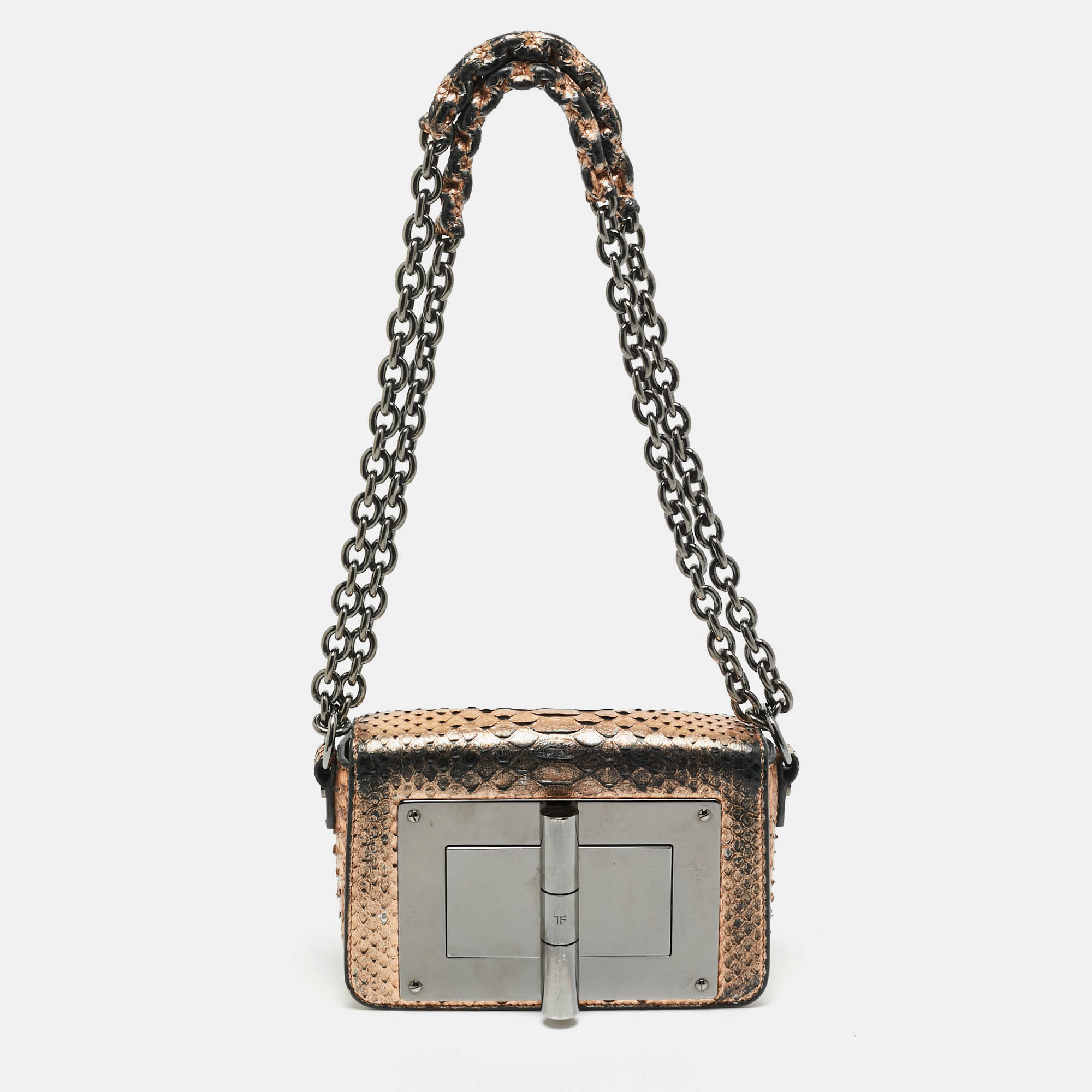 This bronze Natalia bag delivers high appeal with its glossy python leather and chunky chain. A true statement accessory, this item seamlessly elevates any ensemble.
