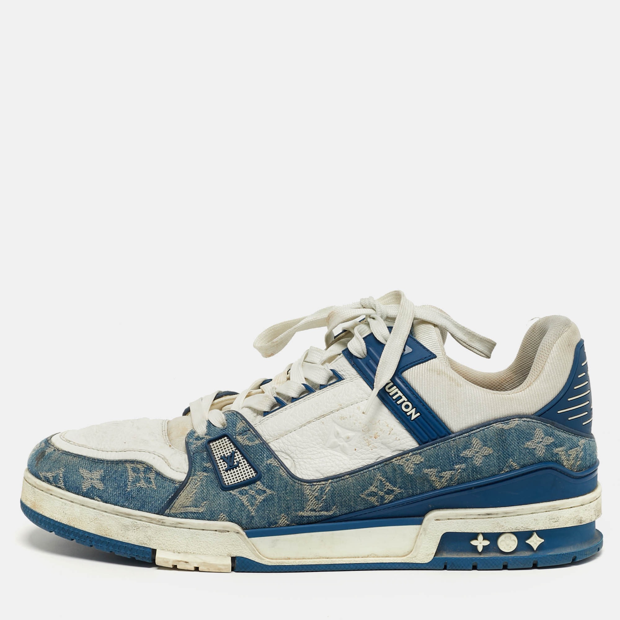 Crafted from a combination of white denim and leather, these Louis Vuitton LV Trainer sneakers offer a modern take on classic court style. The cushioned sole ensures comfort while maintaining a clean, contemporary look. A statement sneaker rooted in luxury craftsmanship.