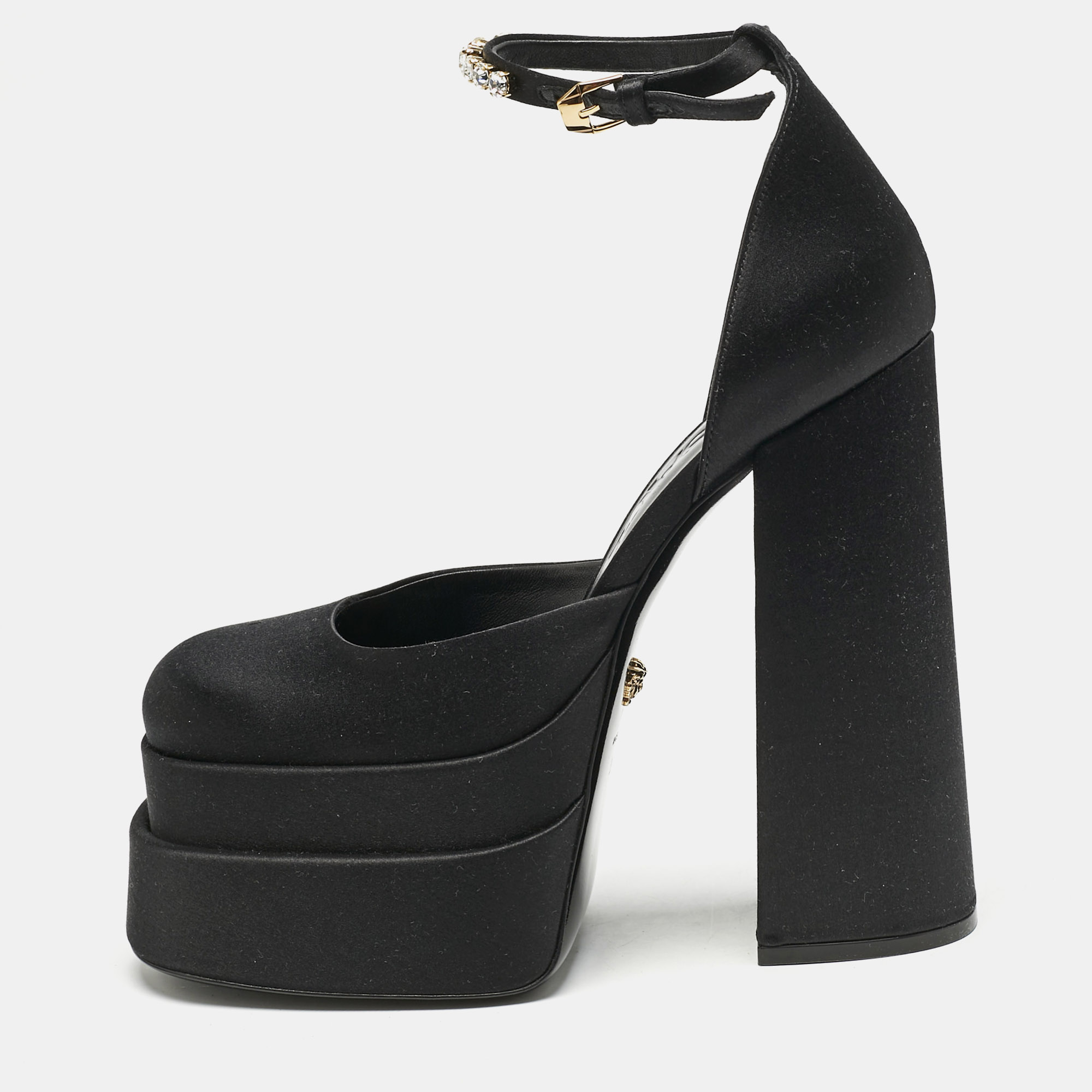 Versace’s ballet flats in black leather and mesh blend soft structure with breathable texture. Embellished detailing at the toe introduces a touch of sparkle, while the low profile ensures comfort. A chic and versatile option for adding subtle glamour to daytime ensembles.