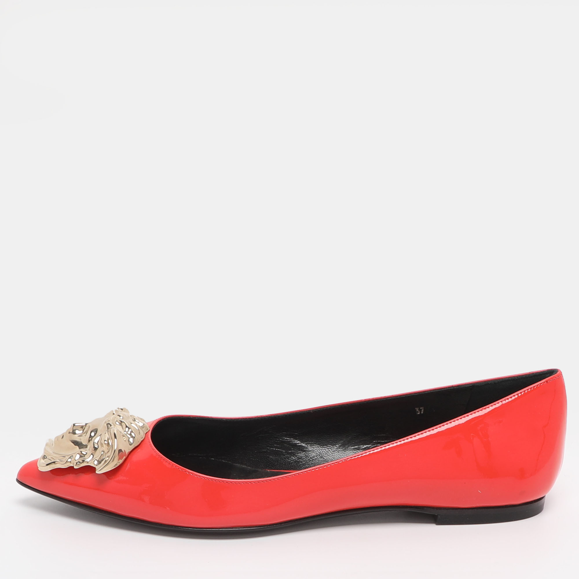 Versace’s ballet flats in red patent leather are defined by the prominent Medusa accent at the toe. The glossy finish and round silhouette create a bold yet feminine statement. A striking option for adding vivid color and iconic detailing to daytime looks.