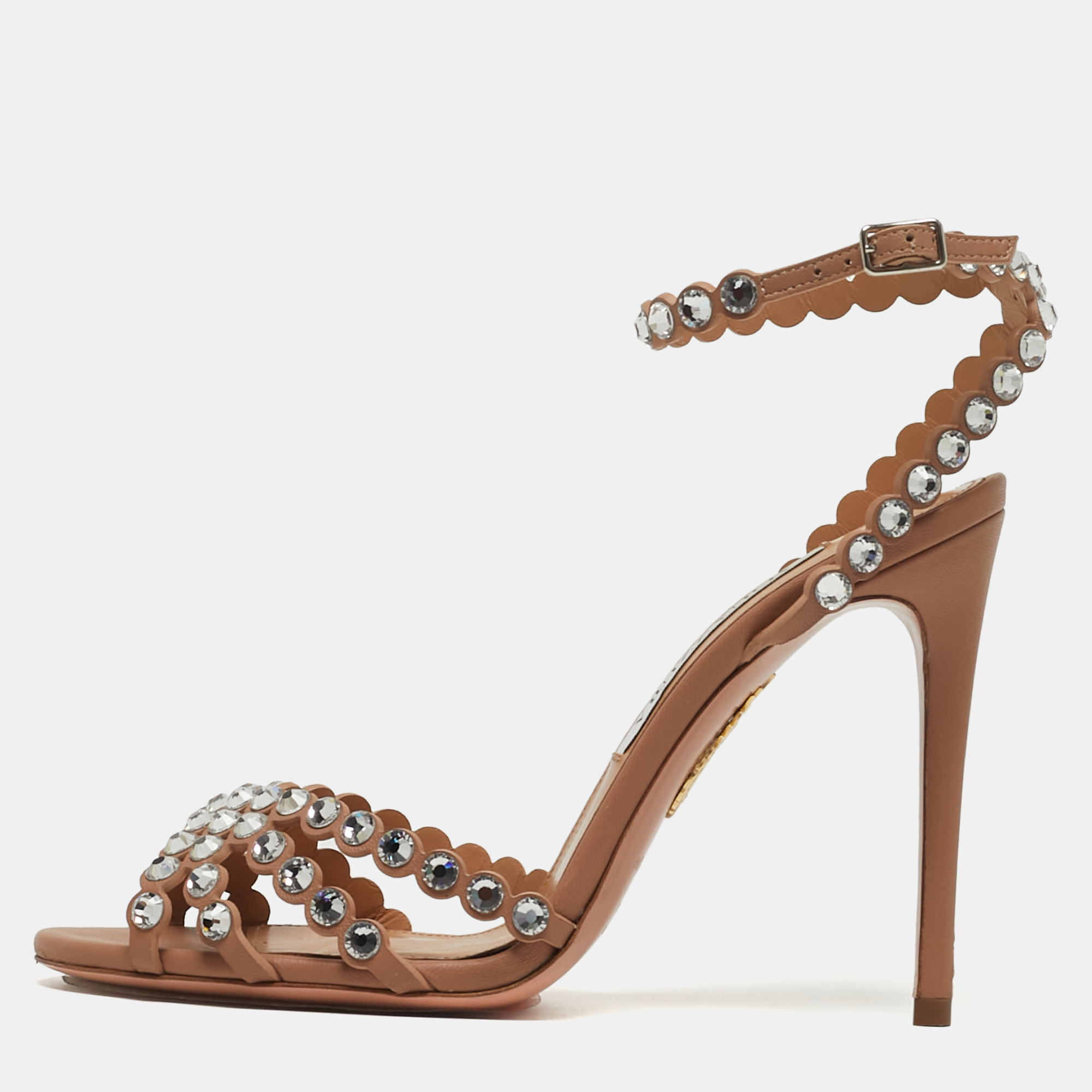 Aquazzura’s Tequila sandals are crafted from beige leather and adorned with delicate crystal embellishments for subtle sparkle. Featuring an elegant ankle strap and 11cm heels, they offer both stability and glamour. Ideal for evening events or festive occasions, these sandals elevate any refined ensemble.