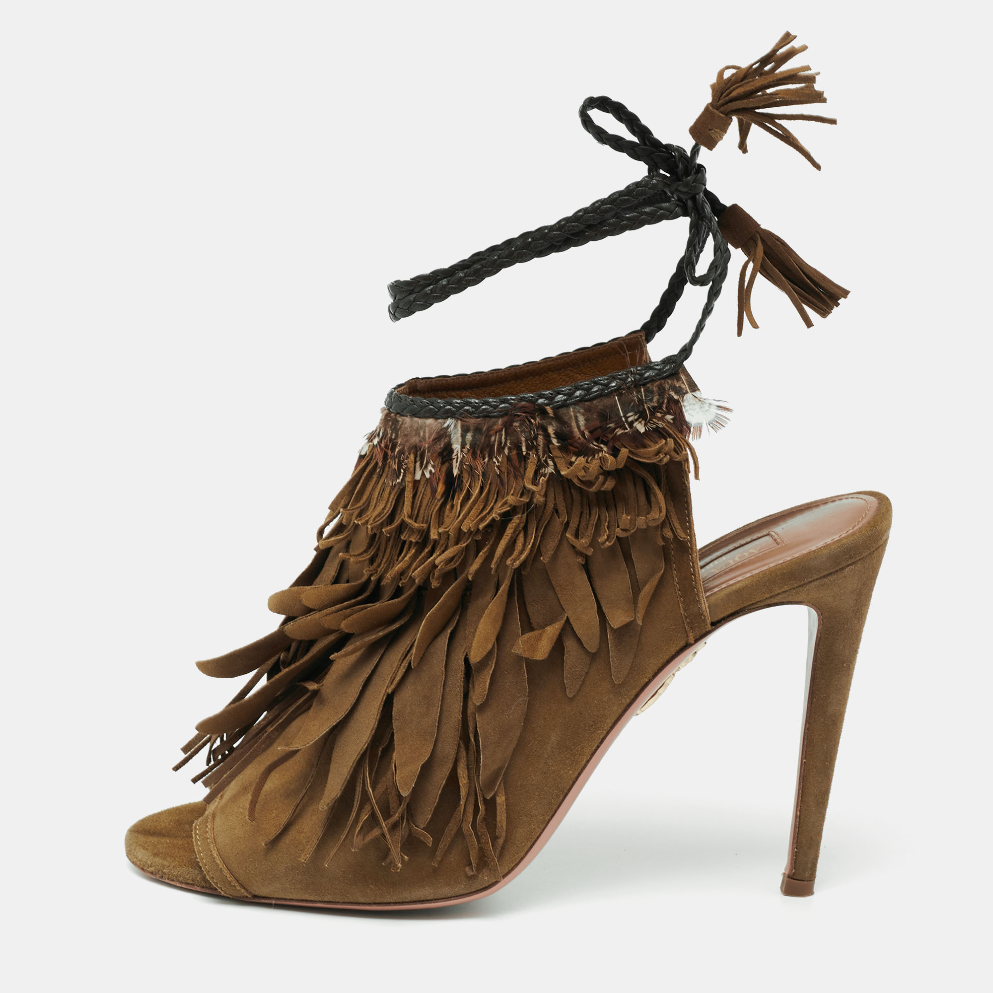 Feel your fashionable best by donning these lovely olive green sandals from Aquazzura. They are crafted meticulously from suede and are decked with chic tassel accents. Slender 11 cm heels and sturdy soles complete this pair that will look gorgeous with short dresses.