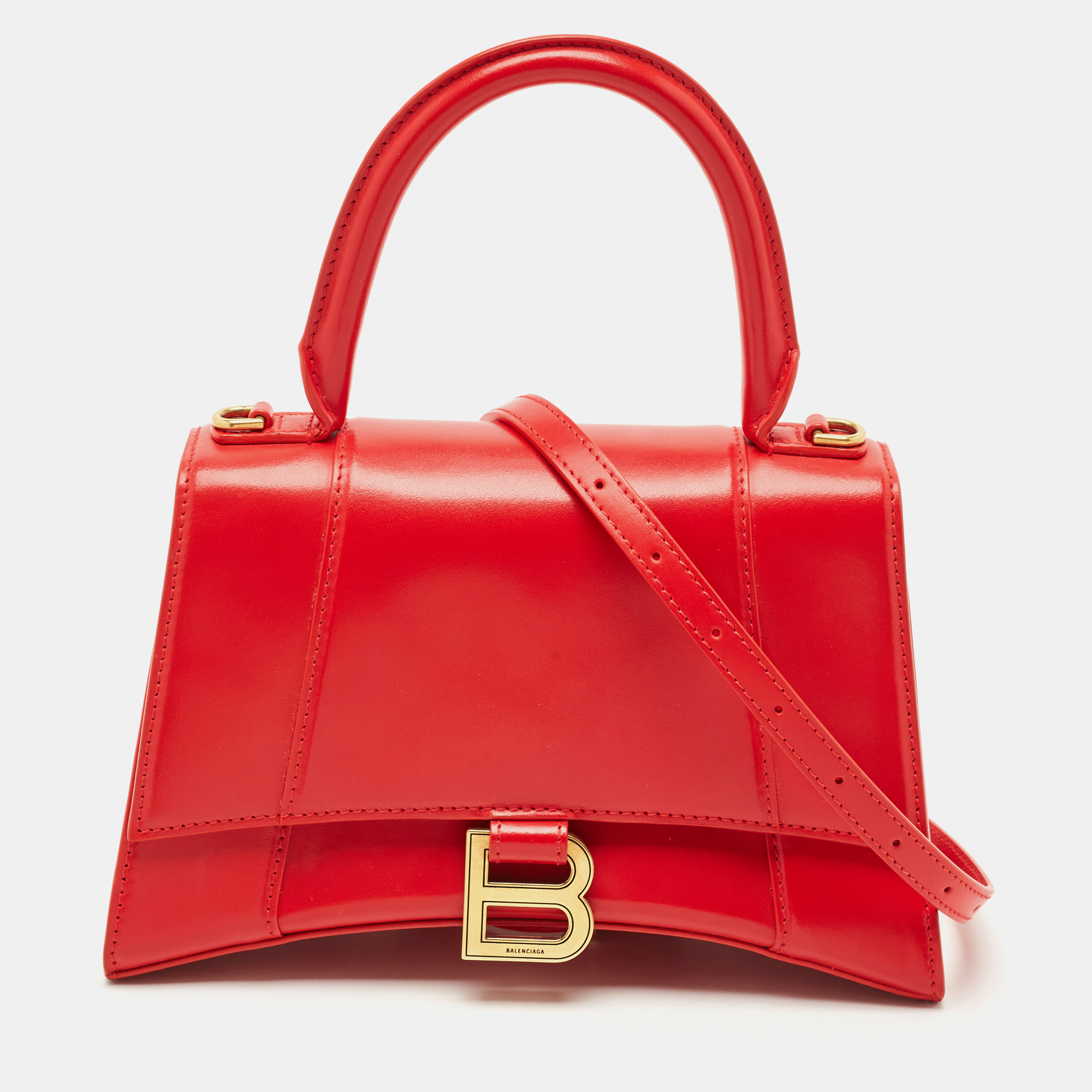 Balenciagas Hourglass bag is fast becoming a must have bag. Crafted using leather, the small Hourglass top handle bag is styled with a flap that has the iconic B logo. The bag has a lined interior, a shapely top handle, and a shoulder strap