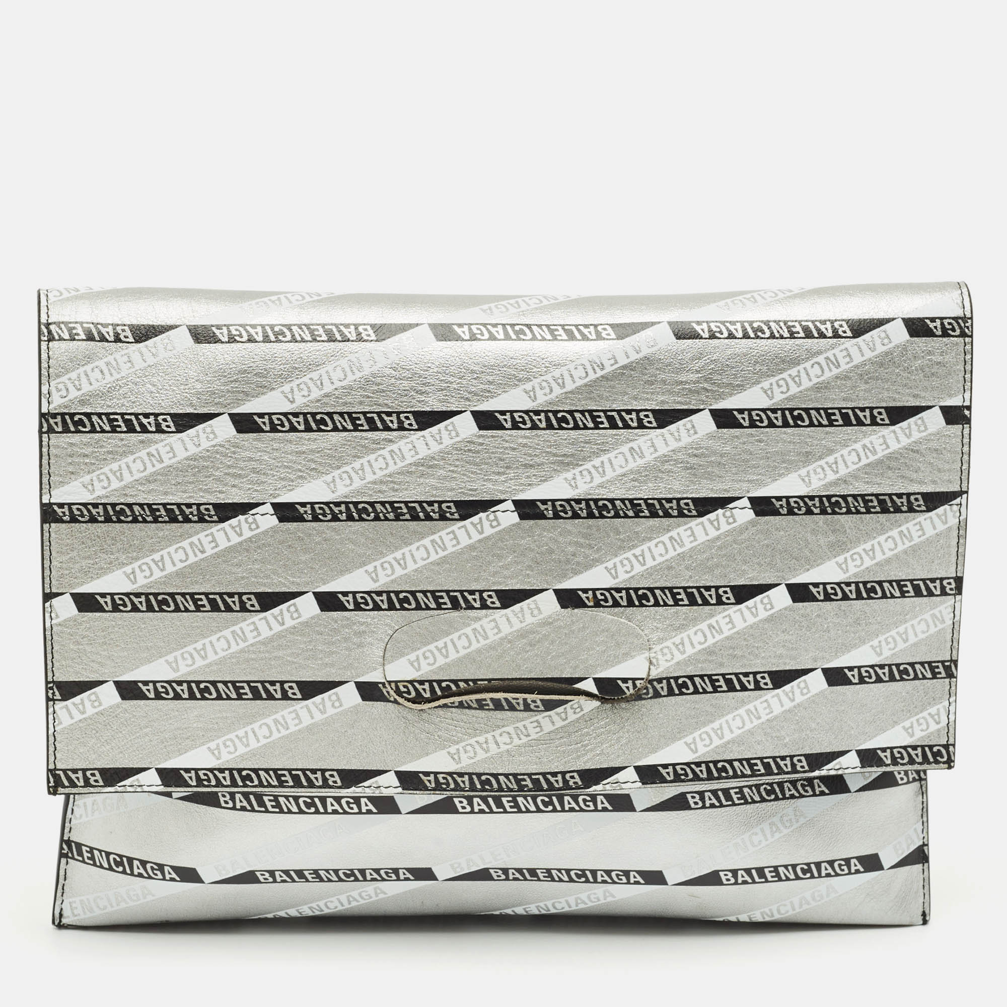 Silver shine meets logo mania in this Balenciaga creation, made from Monogram leather with the silhouette of a disposable bag. A high fashion nod to street culture.