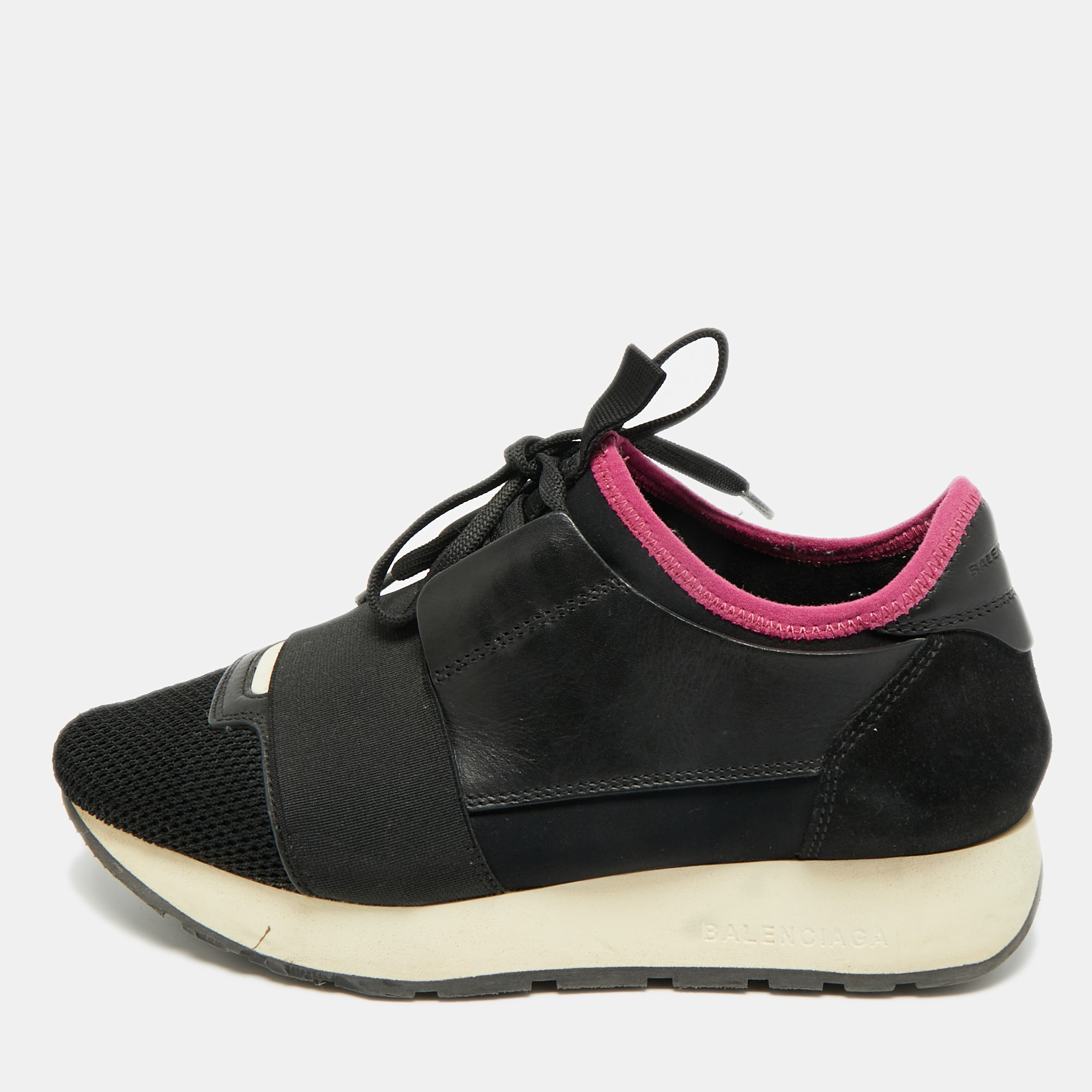 Crafted from a mix of mesh and suede, these Balenciaga Race Runner sneakers deliver a sporty yet elevated aesthetic. The lace up design ensures comfort and support for everyday wear. A contemporary sneaker that blends performance inspired style with luxury appeal.
