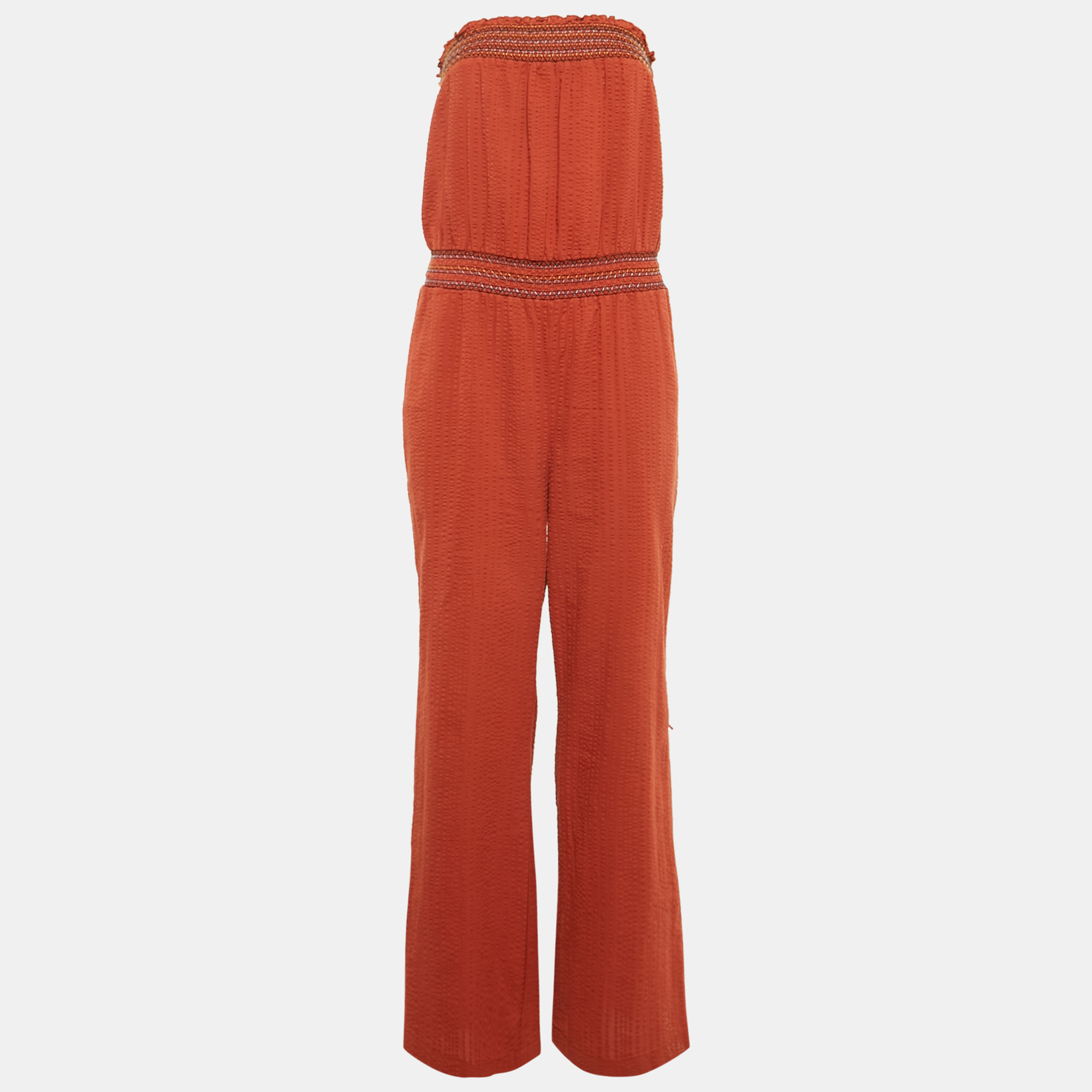 Warm and sunlit in feel, this Boss Orange by Hugo Boss jumpsuit stands out in a rich burnt orange tone. The strapless silhouette and airy seersucker texture make it feel relaxed.