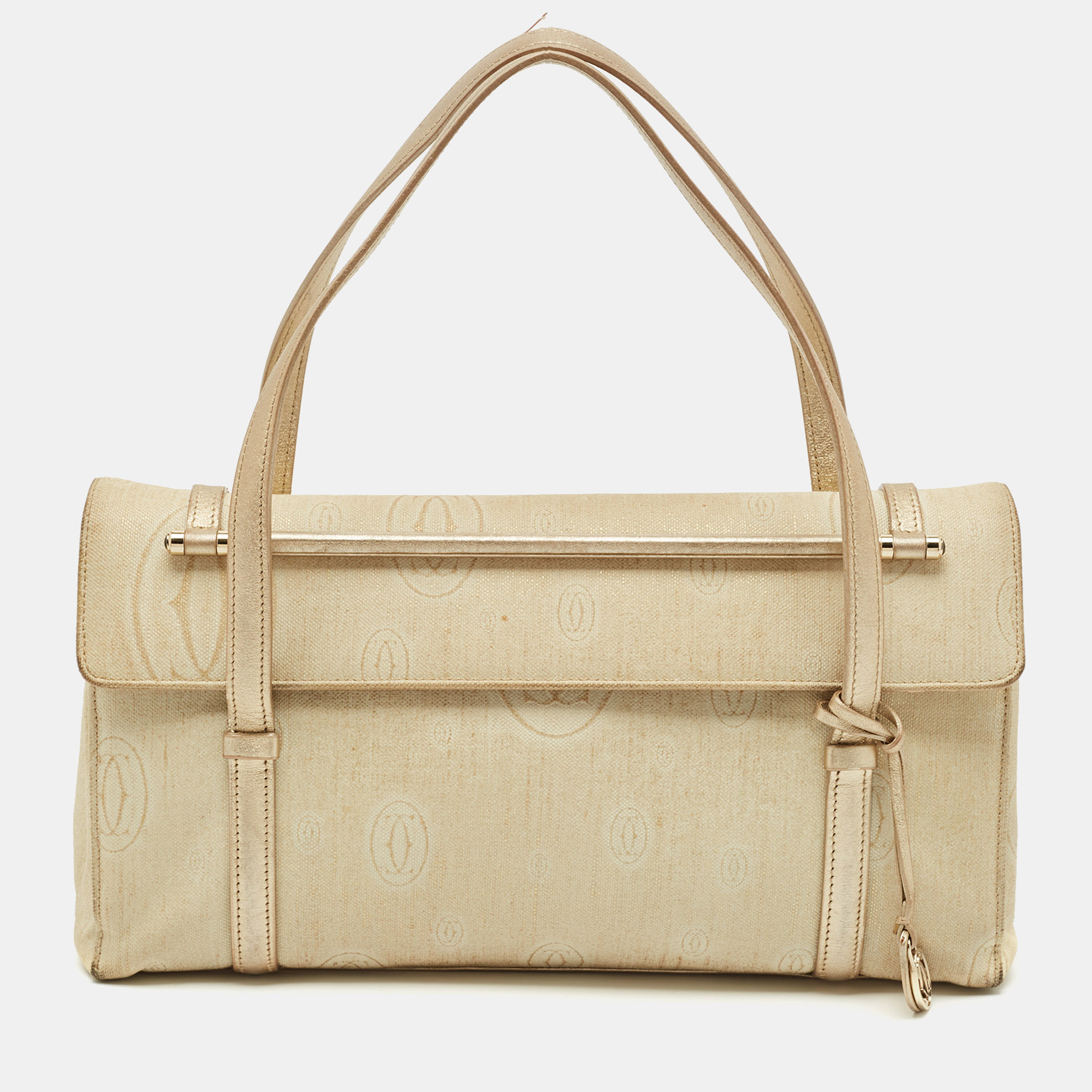 Celebrate timeless elegance with Cartier’s bag. Crafted from shimmering gold fabric and smooth leather, it features refined logo detailing and the signature cabochon accent. With its structured silhouette and sophisticated charm, this piece adds a touch of luxury to any ensemble.