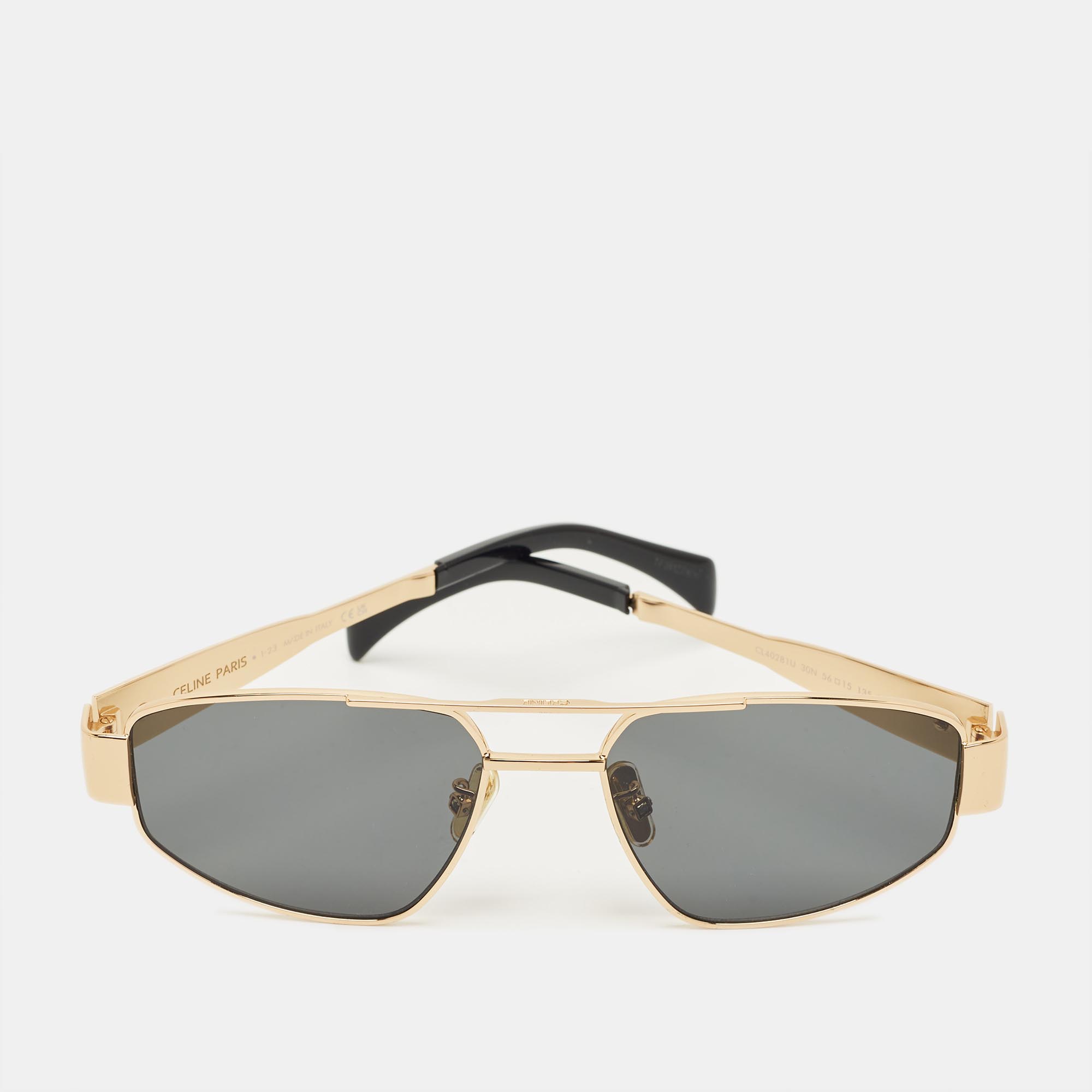 The Celine CL40281U sunglasses reinterpret an aviator shape with a black frame enriched by gold tone Triomphe detailing. The slim profile and tinted lenses lend sophistication, while the geometric structure adds modern appeal. Crafted for those who favor sleek, streamlined silhouettes with subtle branding.