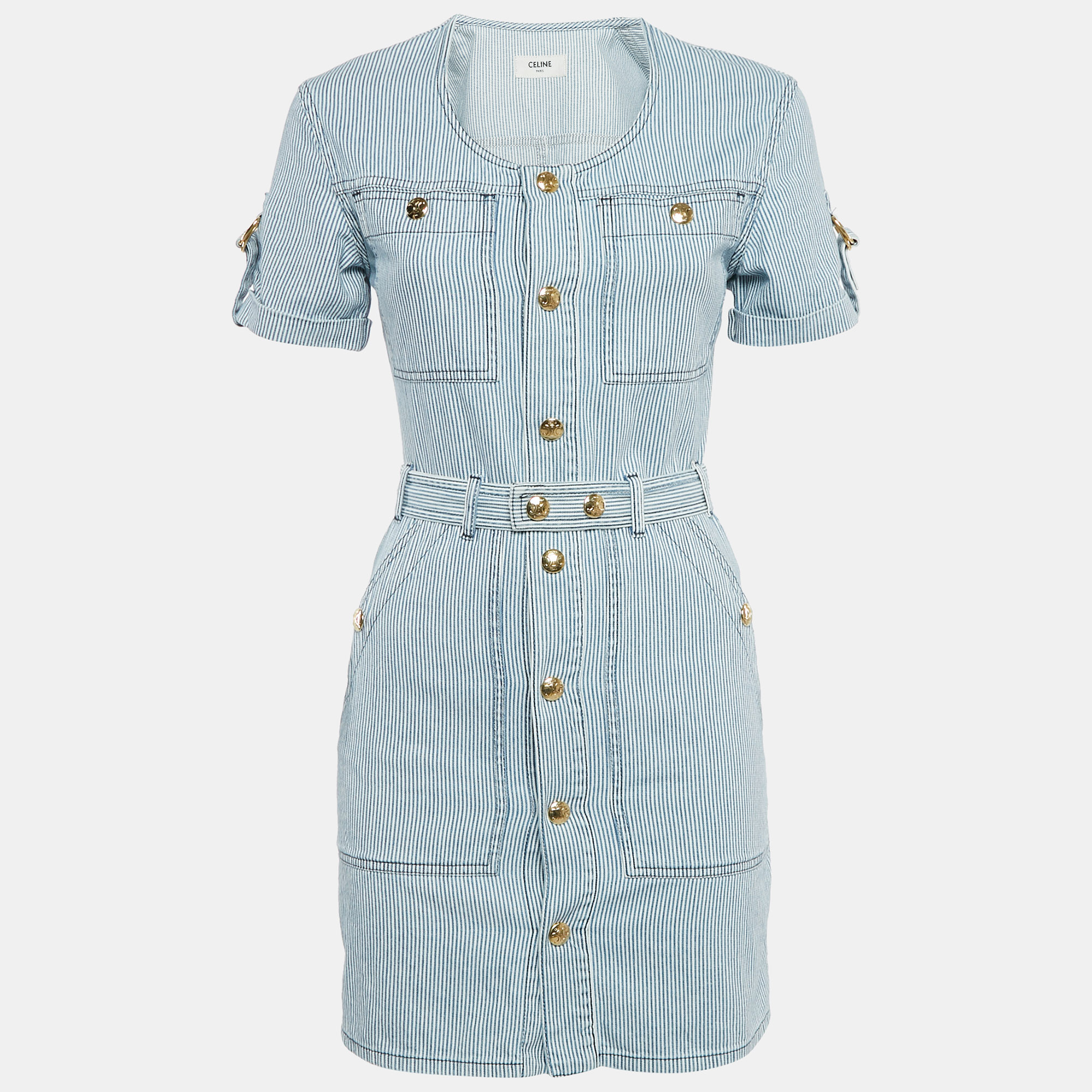 Celine’s striped cotton mini dress features a fitted silhouette and short sleeves. The buttons and belt detail complement the design beautifully.