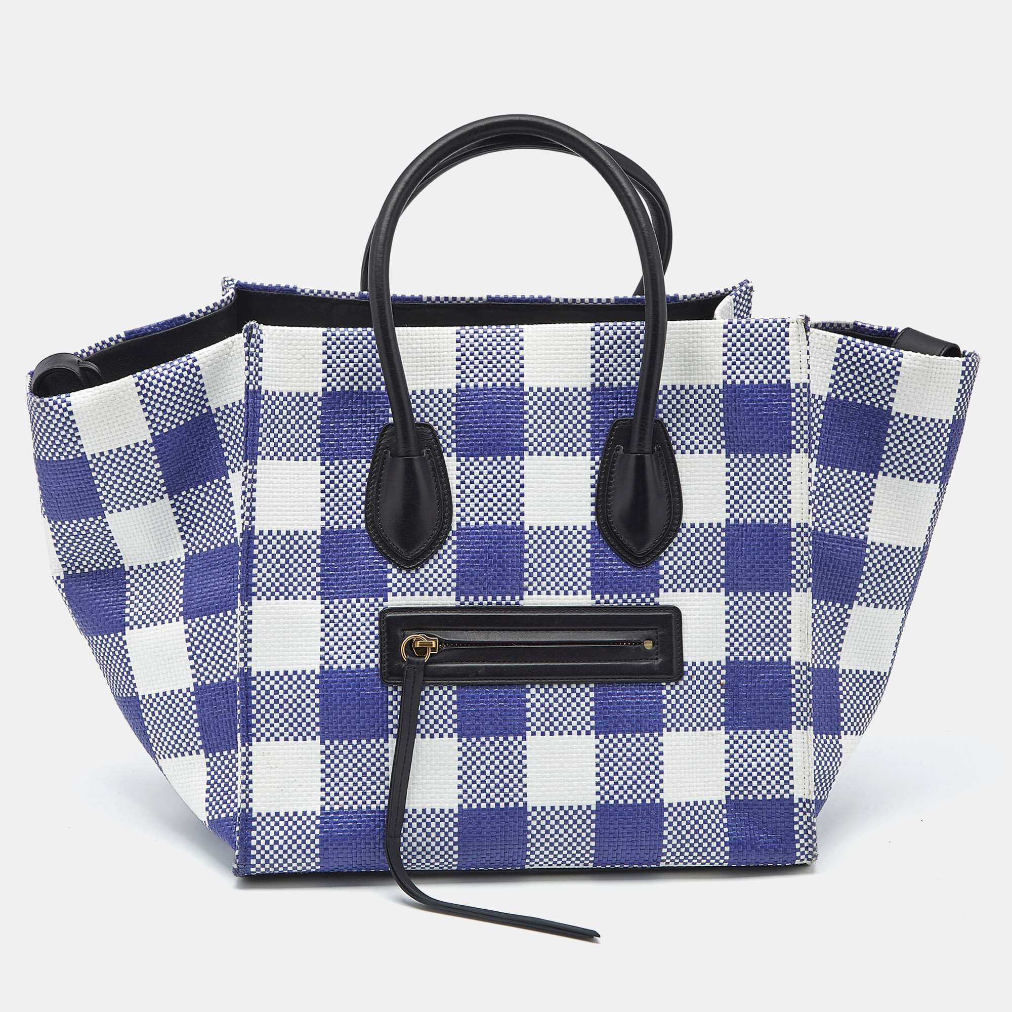 Immerse yourself in elegance with this purple and white gingham tote, beautifully crafted from leather and straw. This bag showcases Celines classic Phantom silhouette, which is enhanced by its distinctive woven design, offering a chic yet playful touch.