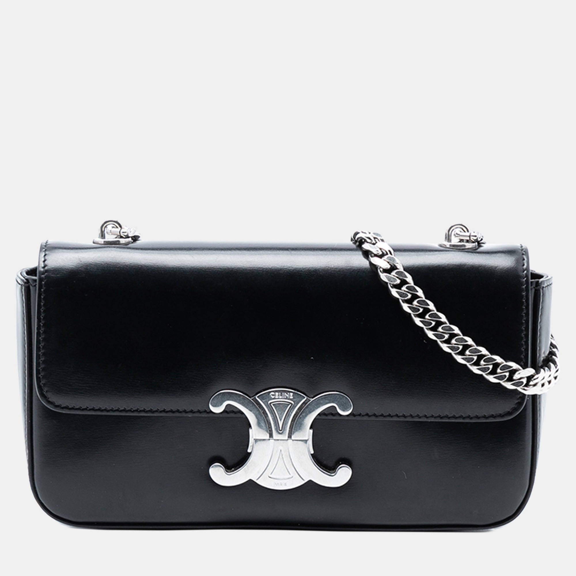 The Celine Triomphe Box shoulder bag is made from shiny calfskin leather in black. Features a structured box shape with a metal Triomphe clasp and adjustable chain strap. The compact interior is designed to carry daily essentials.