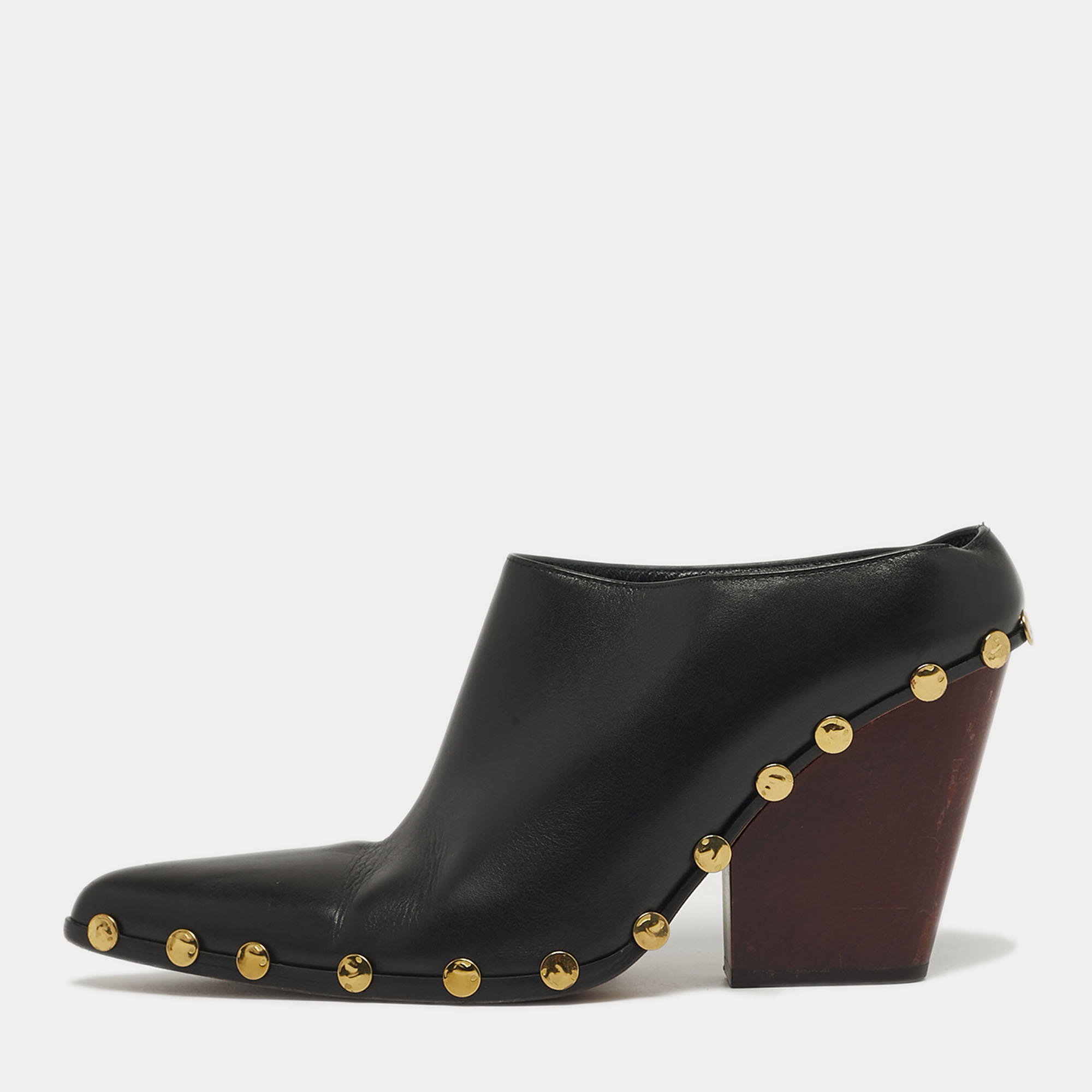 The Celine Rodéo mules are crafted from smooth black leather, showcasing a clean and modern silhouette. Designed for effortless slip on wear and with gold tone studs outlining the exterior, they reflect the brand’s exquisite aesthetic. A versatile piece, perfect for refined everyday and office styling.