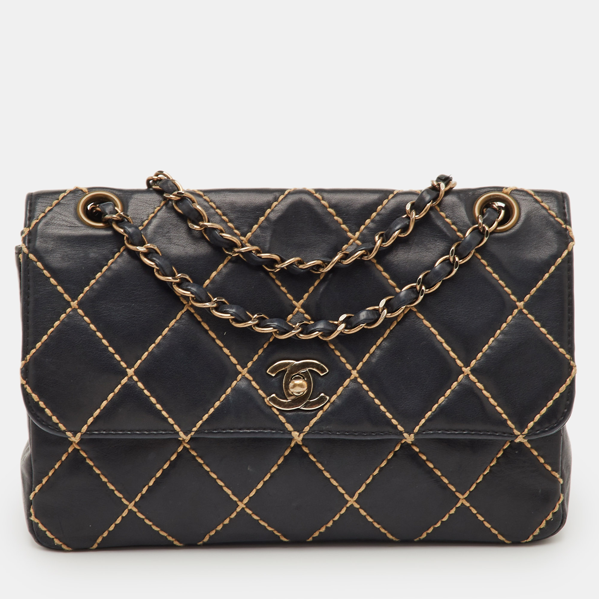 This preloved Chanel Wild Stitch bag is crafted from supple black leather with oversized diamond quilting outlined in contrast stitching. The gold tone chain and CC turn lock complement the hand finished detailing, giving it luxe and character.