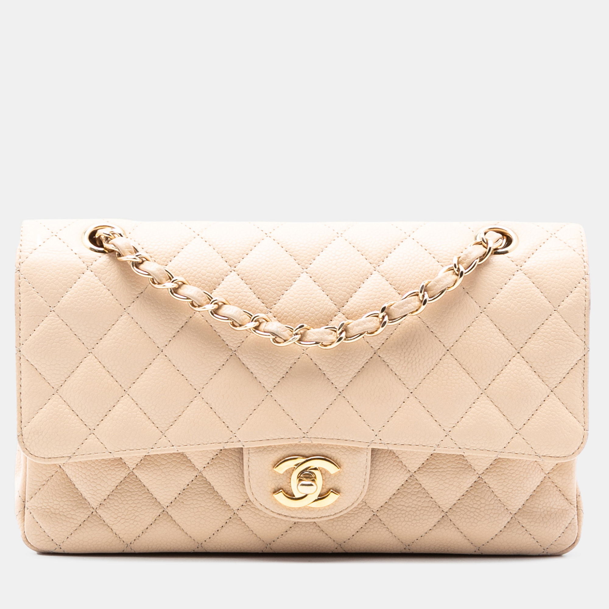 This Chanel Classic Double Flap bag is crafted from durable caviar leather in brown. The medium size includes a structured interior with multiple compartments and a front flap with turn lock closure. Suitable for daily use with a leather interwoven chain strap.
