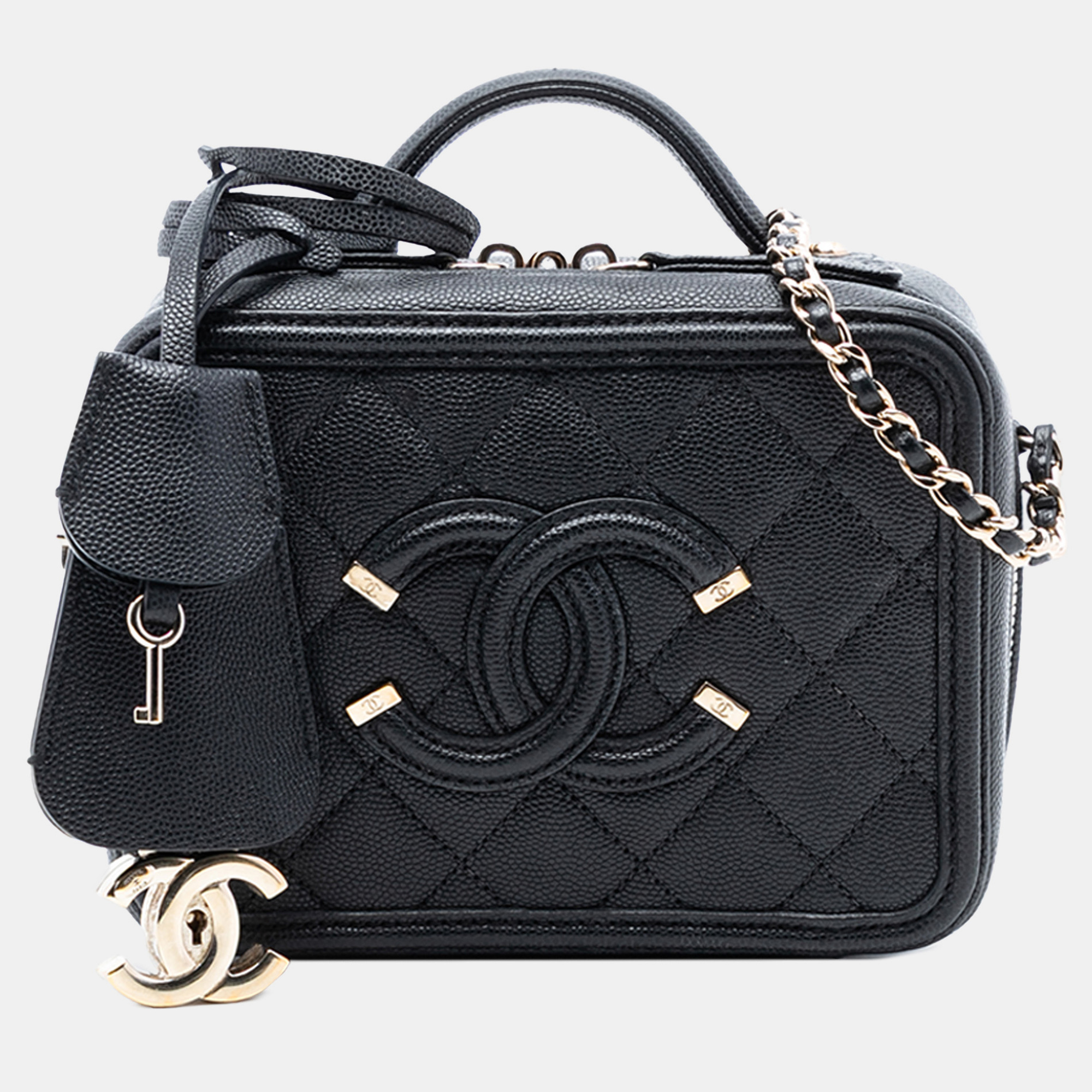 A compact expression of Chanel’s signature elegance, the Mini Vanity Case combines refined structure with intricate detailing. Crafted in black caviar leather, the bag offers durability and a subtly textured finish, while the CC filigree adds a delicate, graphic touch.