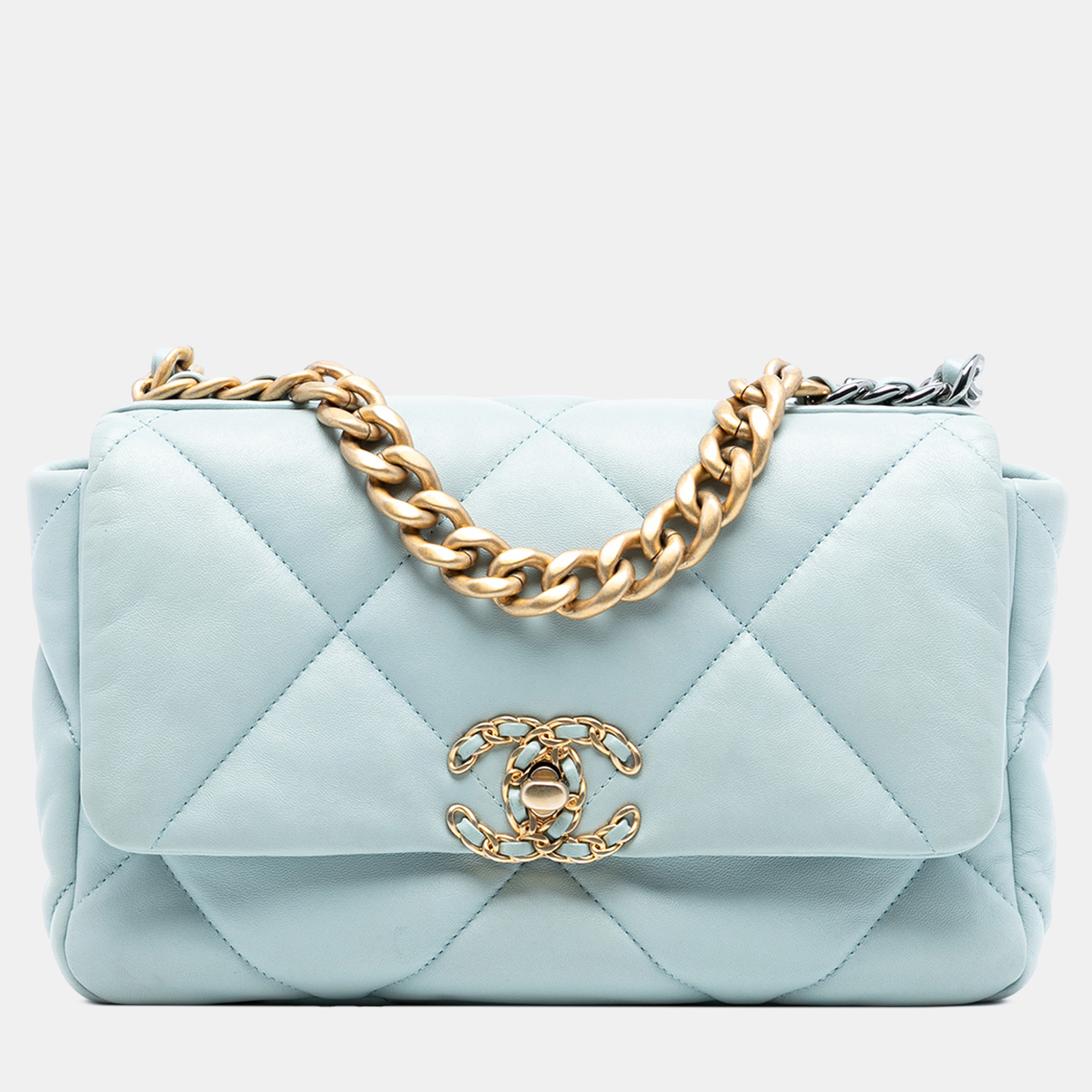 A modern classic with contemporary flair, the Chanel 19 Medium Flap in blue lambskin combines the House’s iconic design language with a soft, luxurious finish. The medium size offers a versatile presence—substantial enough to make a statement, yet refined for everyday elegance.