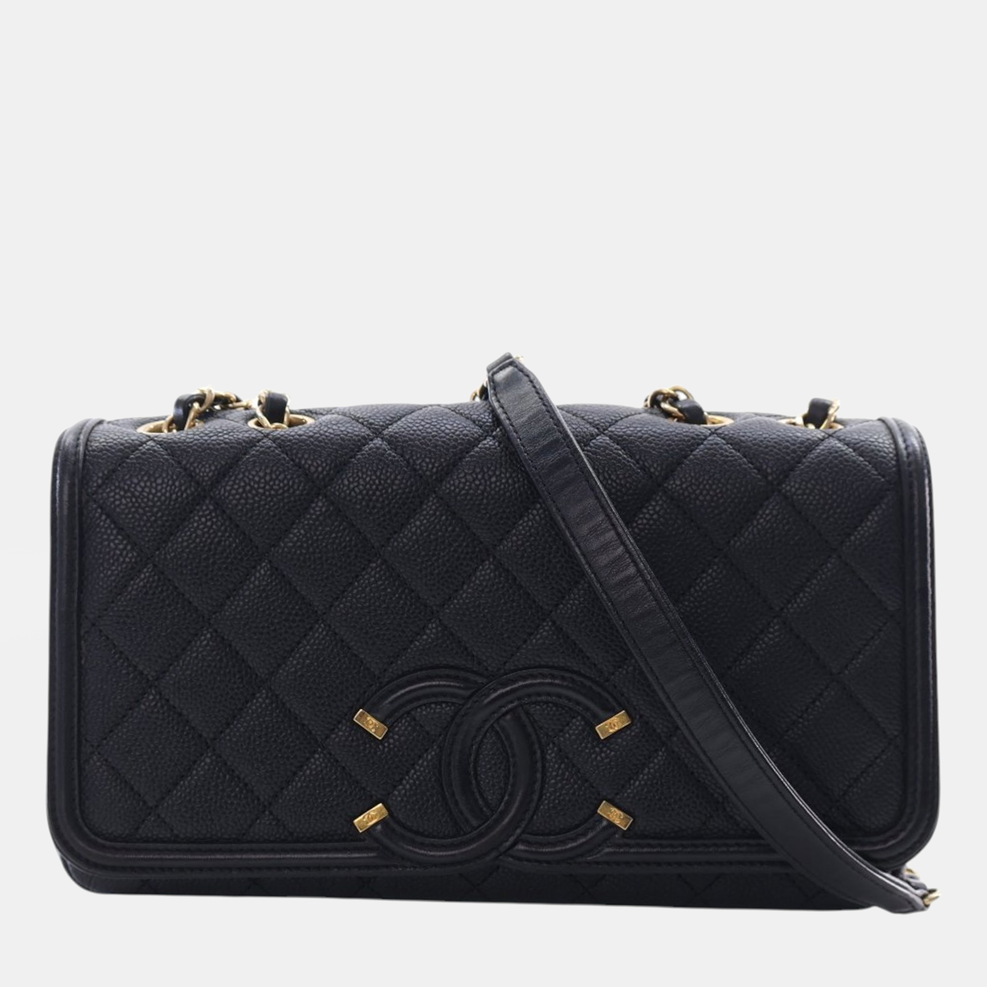 This medium CC Filigree Flap bag is made from durable caviar leather and detailed with metal logo accents. The structured design offers organized storage with interior compartments, making it practical for regular use. The top handle and chain strap allow for multiple styling options.