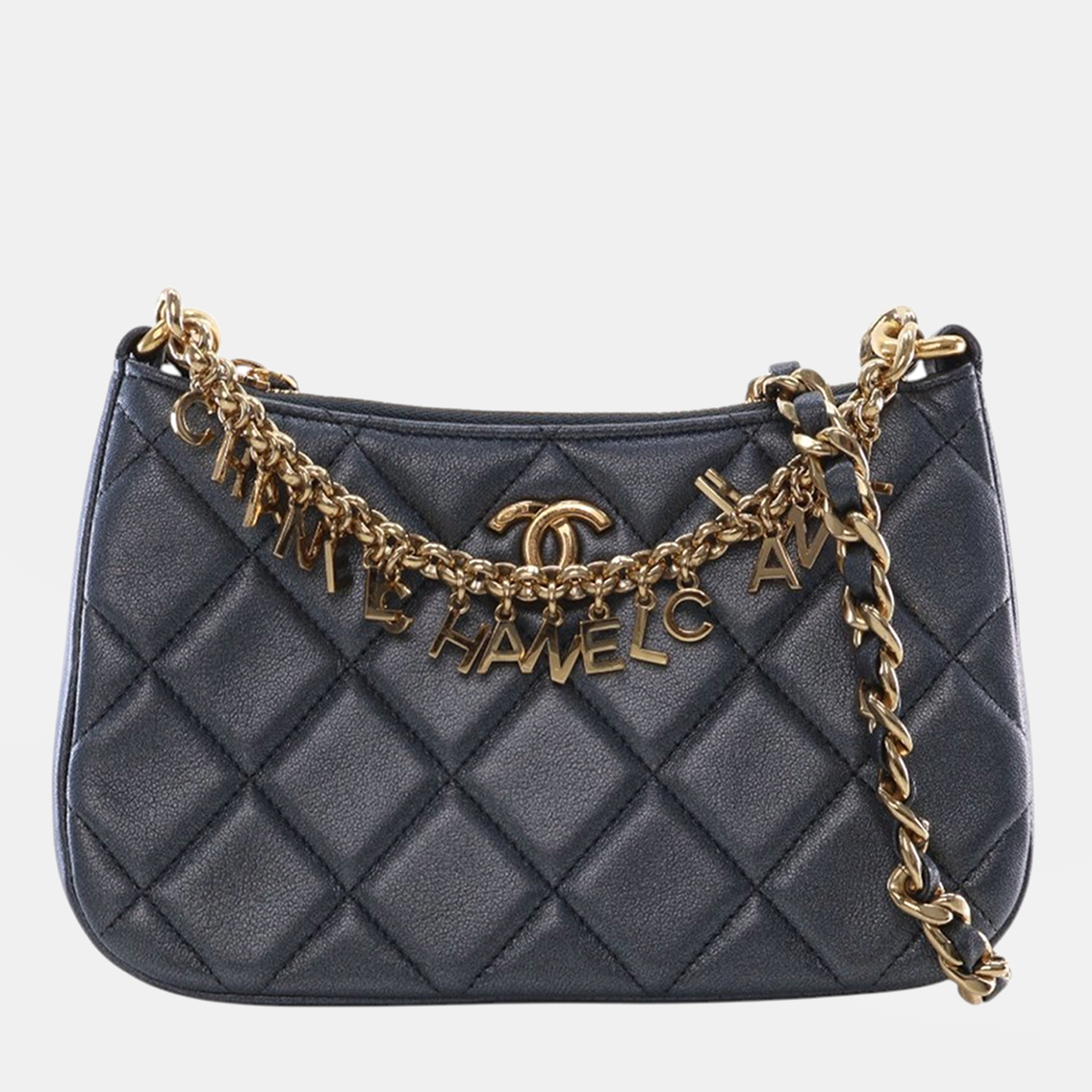 The small quilted lambskin logo chain crossbody is a lightweight bag designed for hands free wear. Made from smooth lambskin leather, it features a front logo detail and a slim chain strap. Its compact size makes it suitable for carrying essentials while on the go.