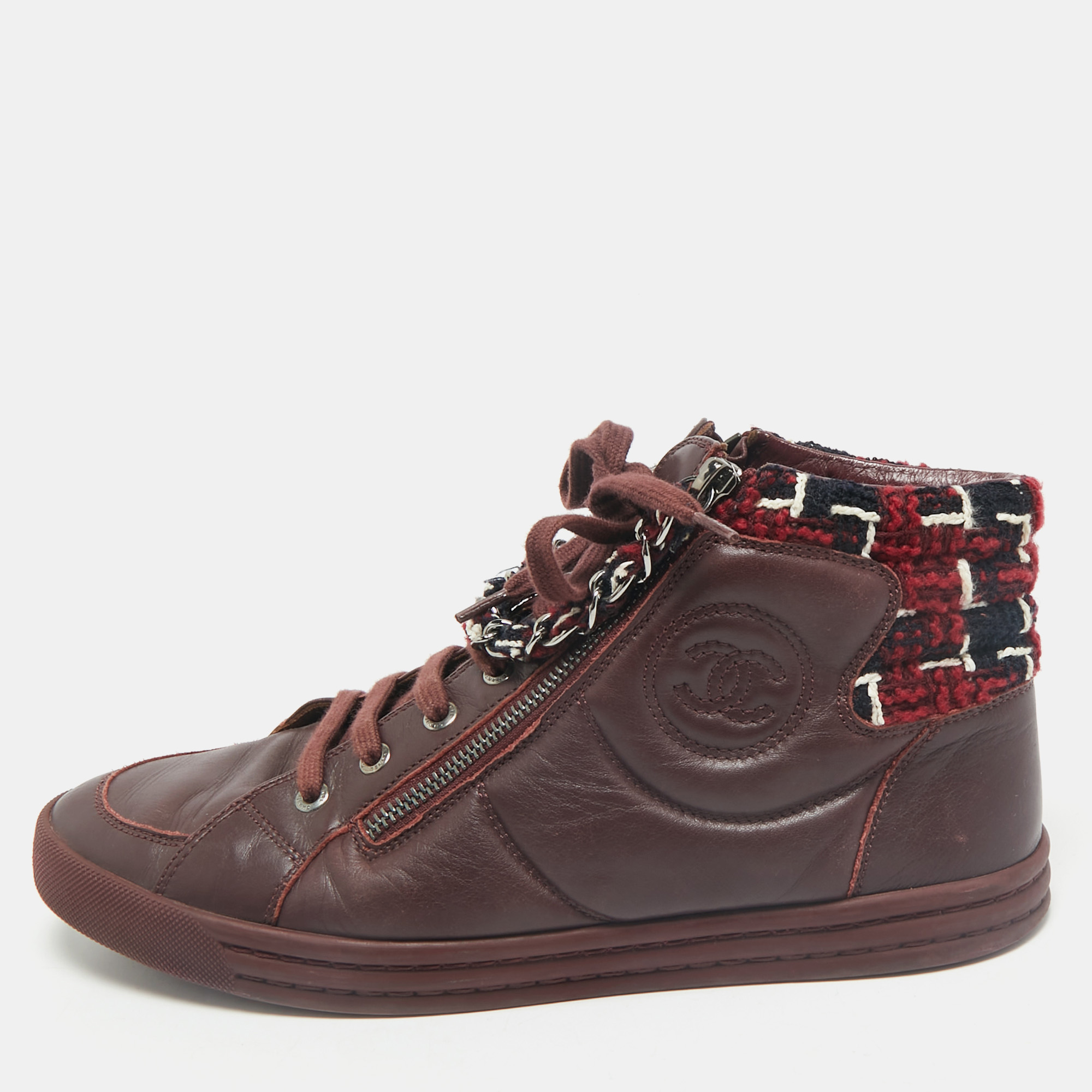 These Chanel high top sneakers for women blend sporty lines with house signatures: quilted burgundy leather, tweed panels, and CC branding.
