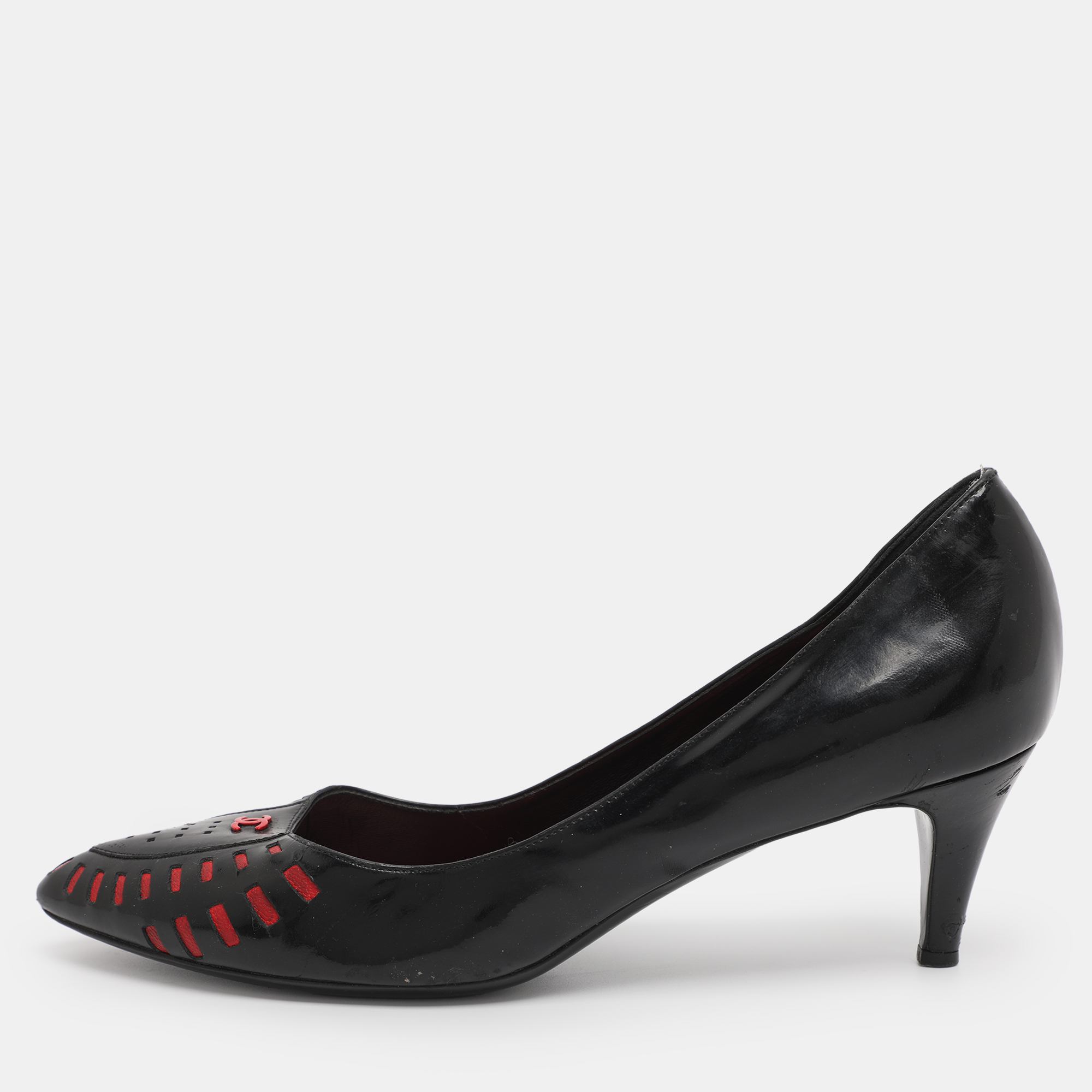 Understated yet polished, these Chanel pumps are rendered in sleek black patent leather. With their versatile design and timeless elegance, they are a staple for both professional and evening wardrobes.