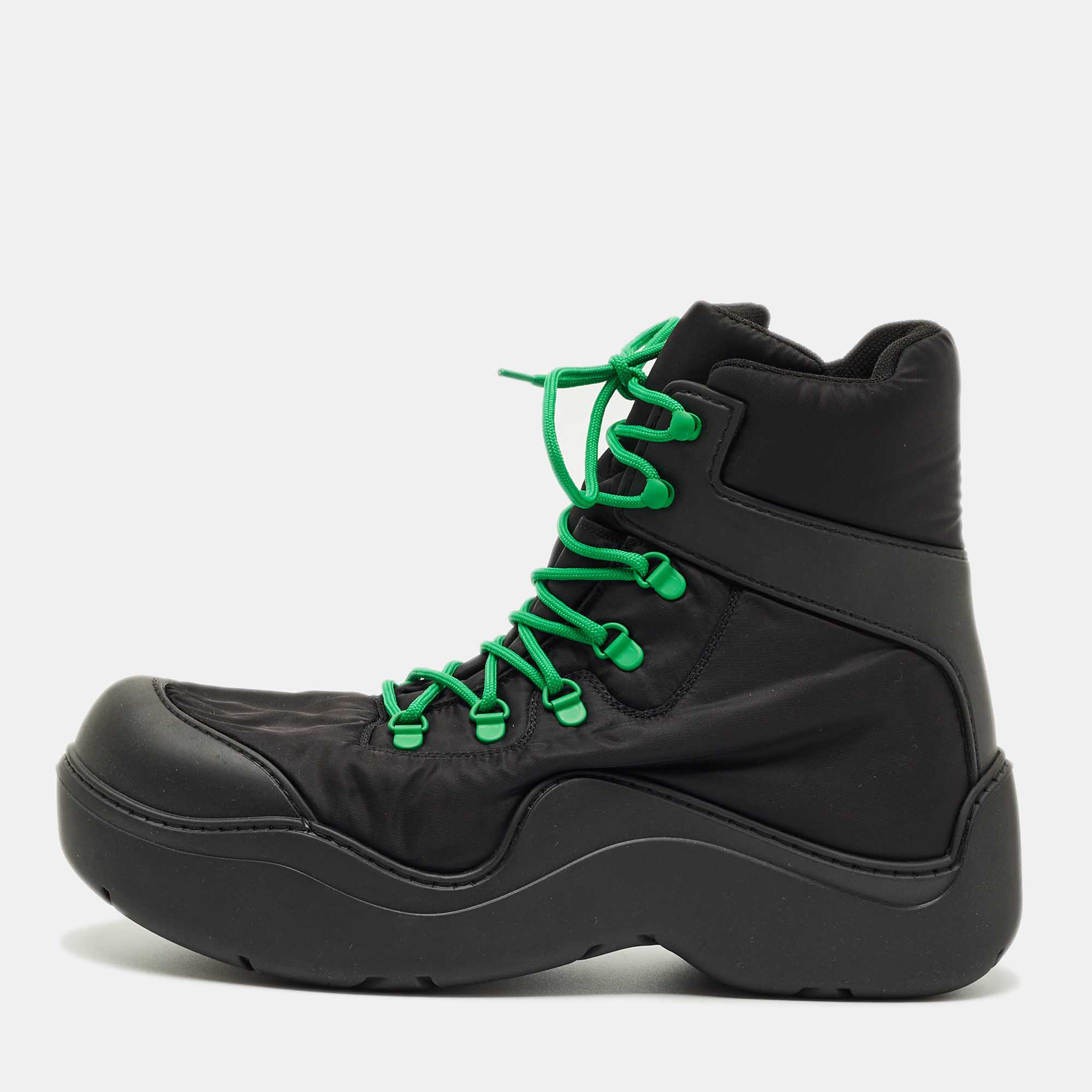Contemporary and utilitarian, these Puddle Bomber boots by Bottega Veneta are crafted from black nylon with a weather ready construction. The molded ankle silhouette is modern and functional—ideal for navigating transitional days in style.