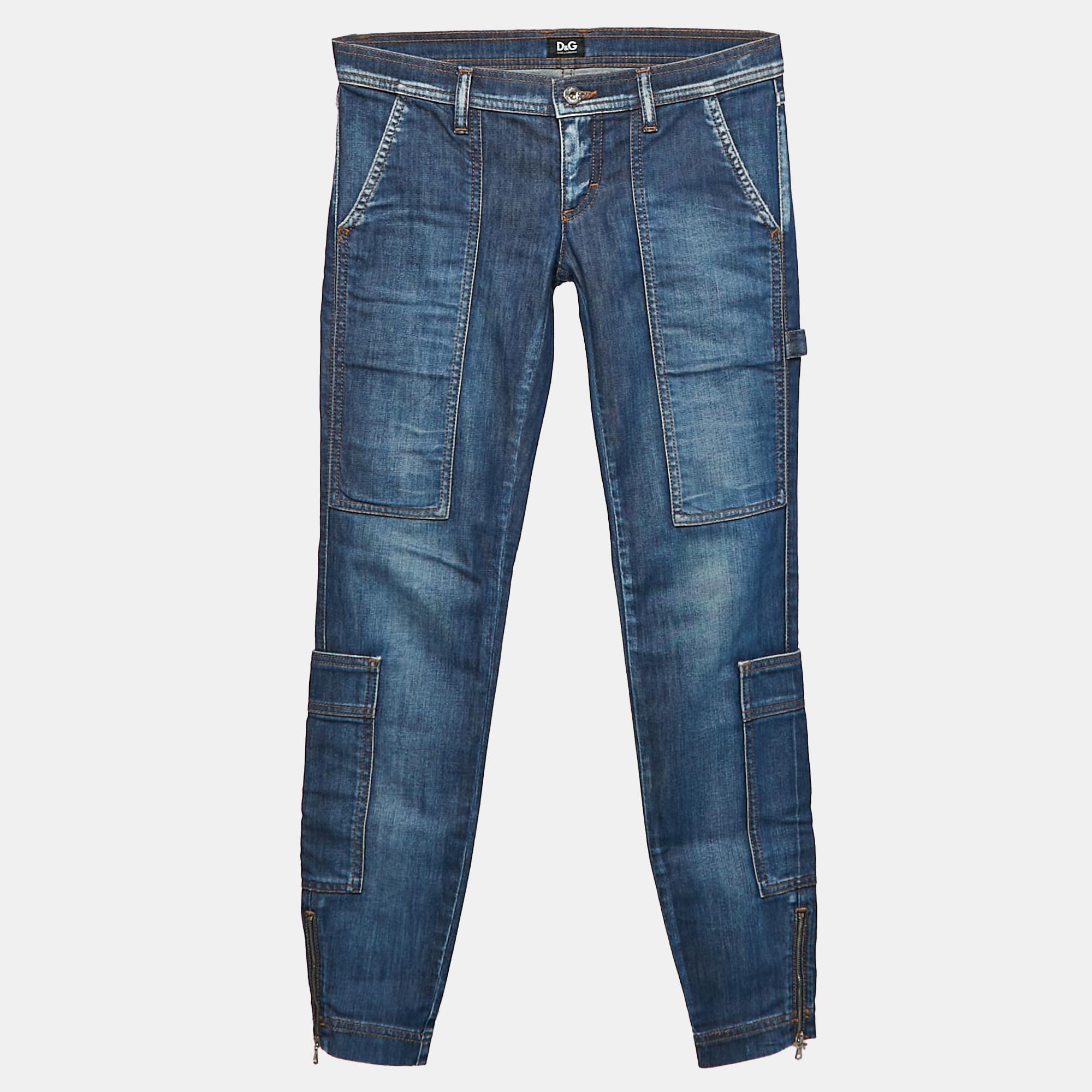 These D and G cargo jeans in a blue washed denim feature a low waist and practical pockets, blending a relaxed vibe with a touch of urban edge.
