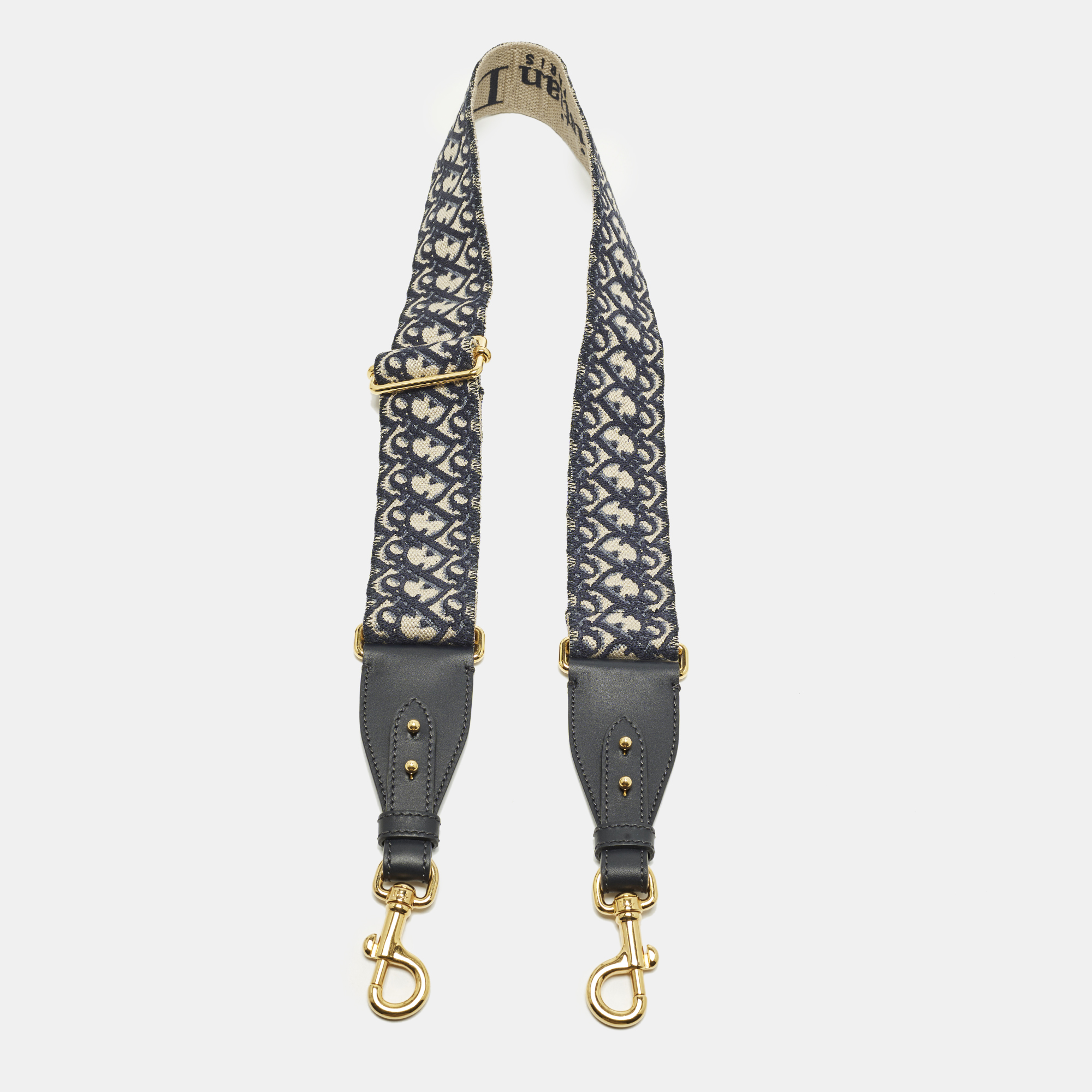 This Dior shoulder strap combines navy blue and beige embroidered canvas with leather detailing. Designed to attach to compatible bags, it offers a structured way to refresh styling. The embroidered surface adds texture and contrast while maintaining versatility for interchangeable wear across multiple bag silhouettes.