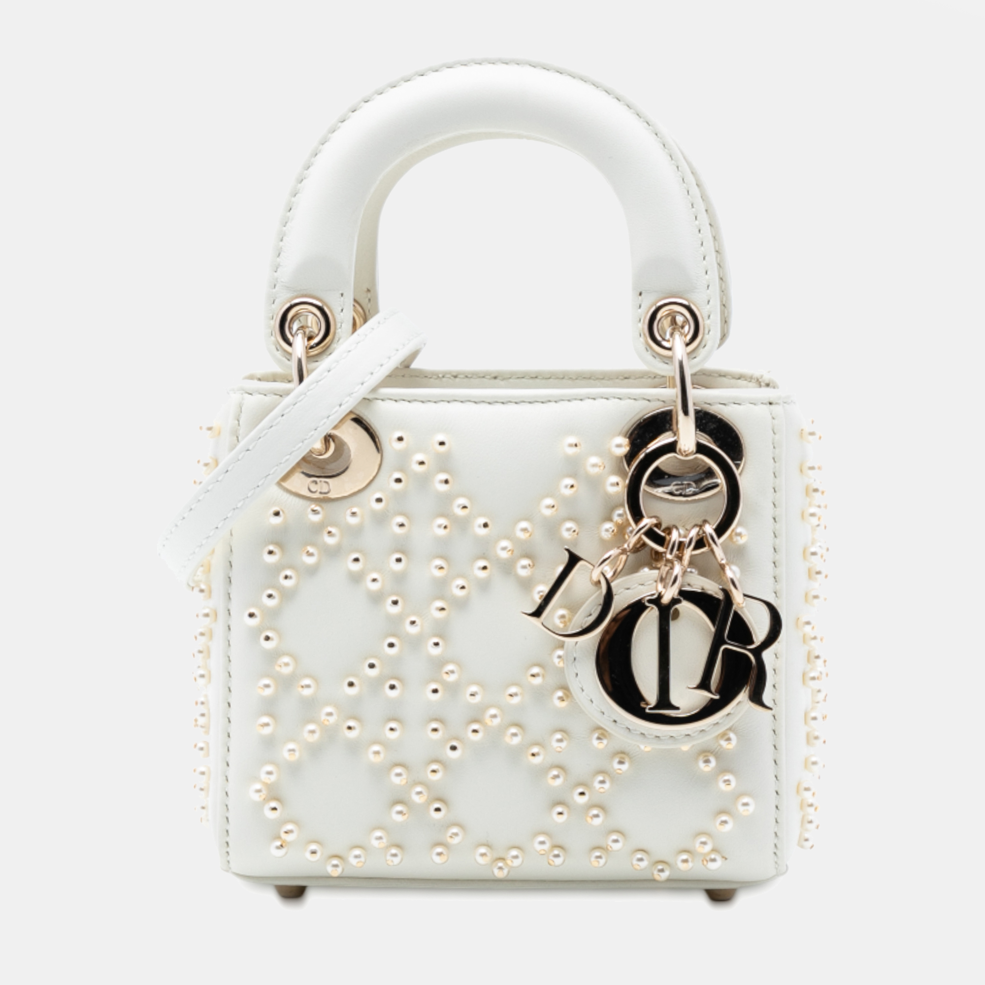 Delicate and luminous, this micro Lady Dior in white lambskin is elevated by iconic Cannage quilting and pearl inspired accents. Petite yet impactful, it embodies Dior’s couture sensibility through refined texture and elegant proportion. A jewel like creation designed to make a subtle yet unforgettable statement.