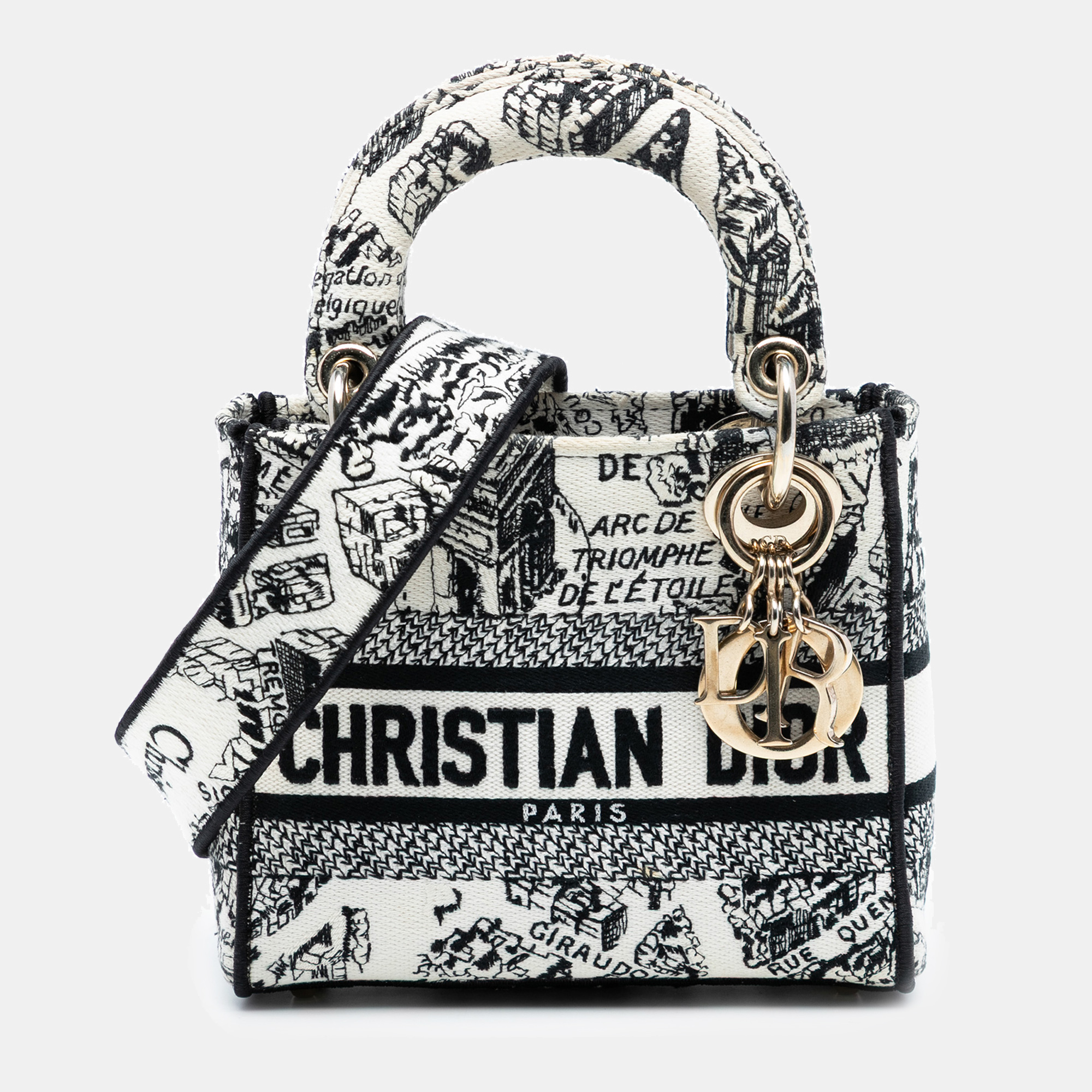 The Mini Lady D Lite is made from embroidered canvas featuring the Plan de Paris motif. This structured mini tote includes top handles and a detachable strap for shoulder or crossbody use. The detailed embroidery and compact size make it a standout piece while remaining practical for carrying essentials.