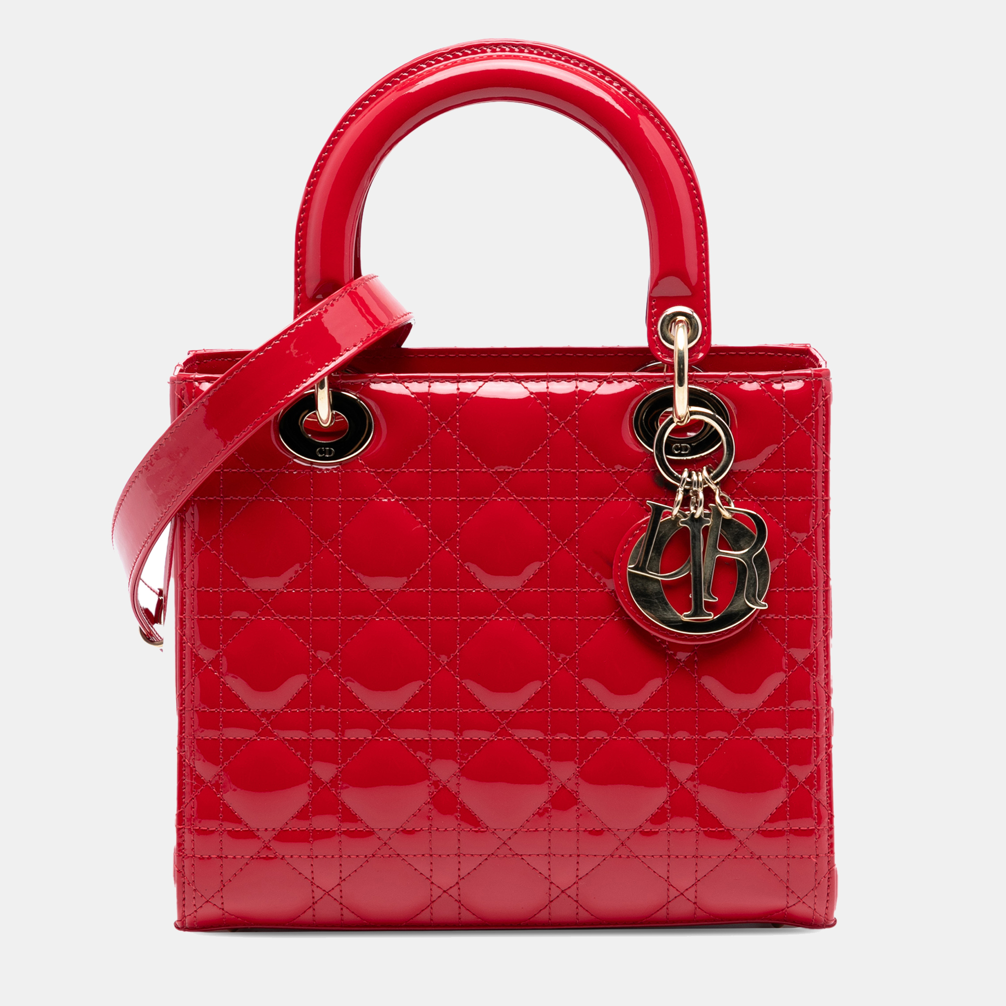 Crafted from patent leather with a cannage stitched pattern, this medium handbag features top handles and a detachable shoulder strap. The structured design suits both formal and casual settings.