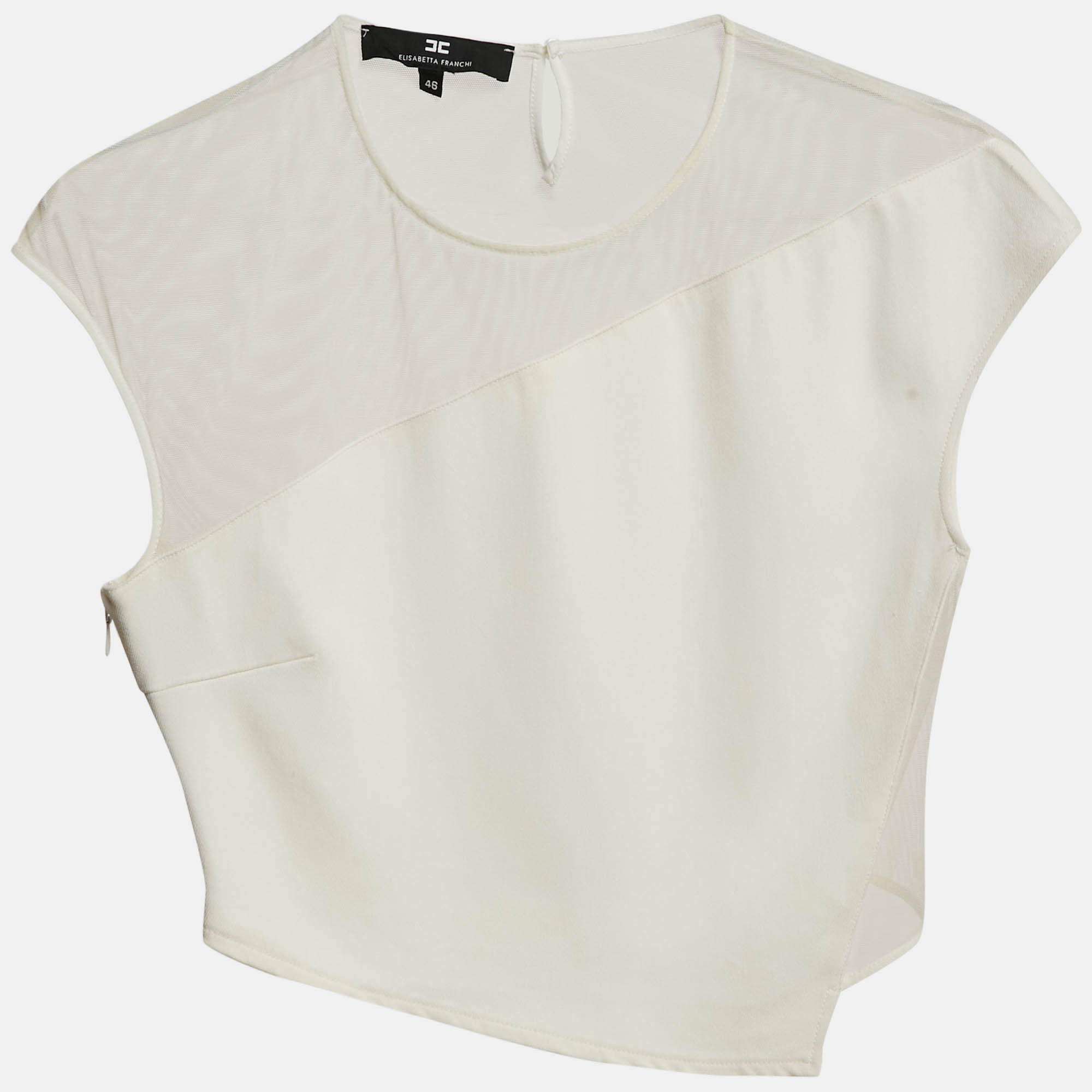 The layered trim at the neckline gives this Elisabetta Franchi top a soft, sculpted look that stands out right away. The white crepe falls smoothly, and the contrast piping adds a small graphic edge. It works well with tailored pants or denim when you want something simple with a bit of interest.