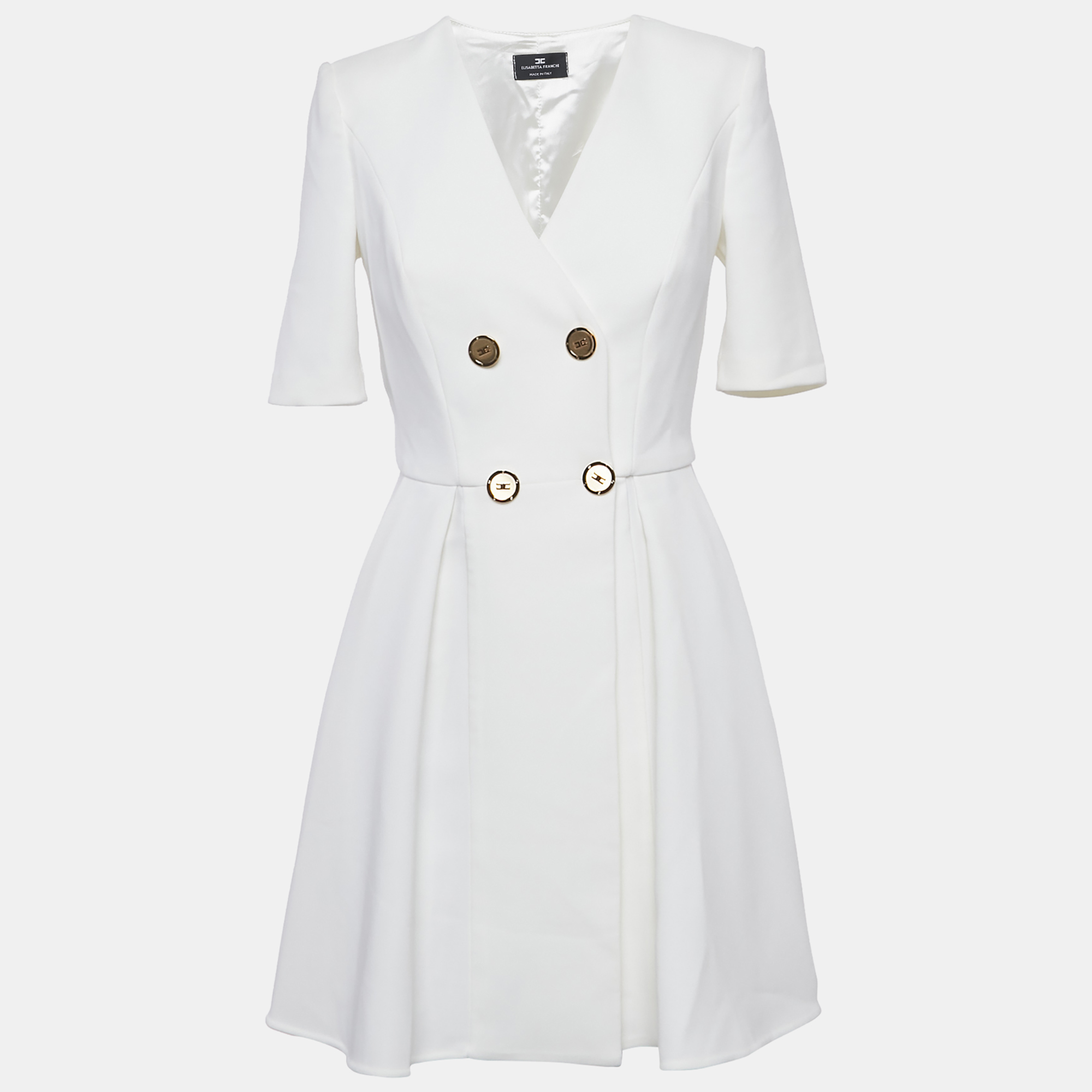 Crisp white sets the tone for this Elisabetta Franchi mini dress, shaped by a double breasted front and soft pleats through the skirt. The tailored look feels balanced by short sleeves, making it suitable for daytime events or styled evenings.