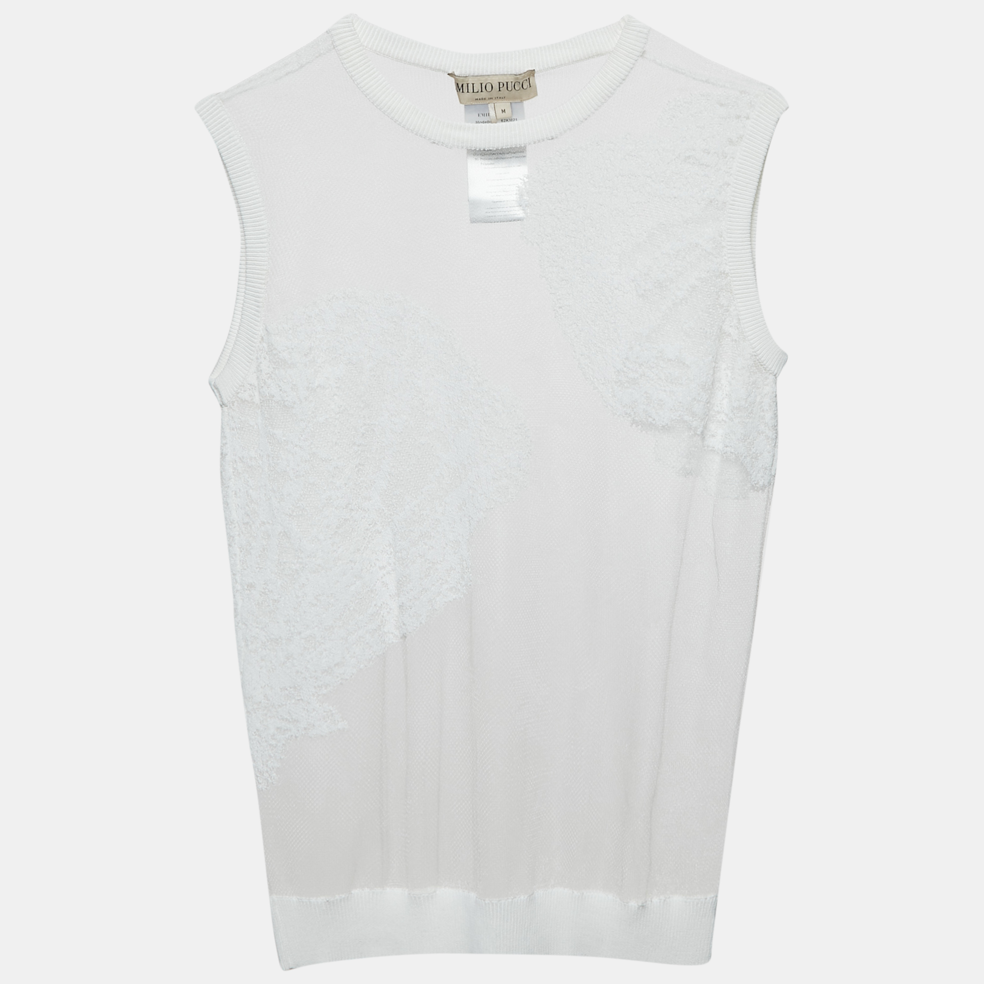 This sleeveless top from Emilio Pucci is crafted in sheer white mesh with intricate embroidery. Lightweight and delicate, it’s an effortless layering piece with signature flair—ideal for pairing with high waisted skirts or denim.