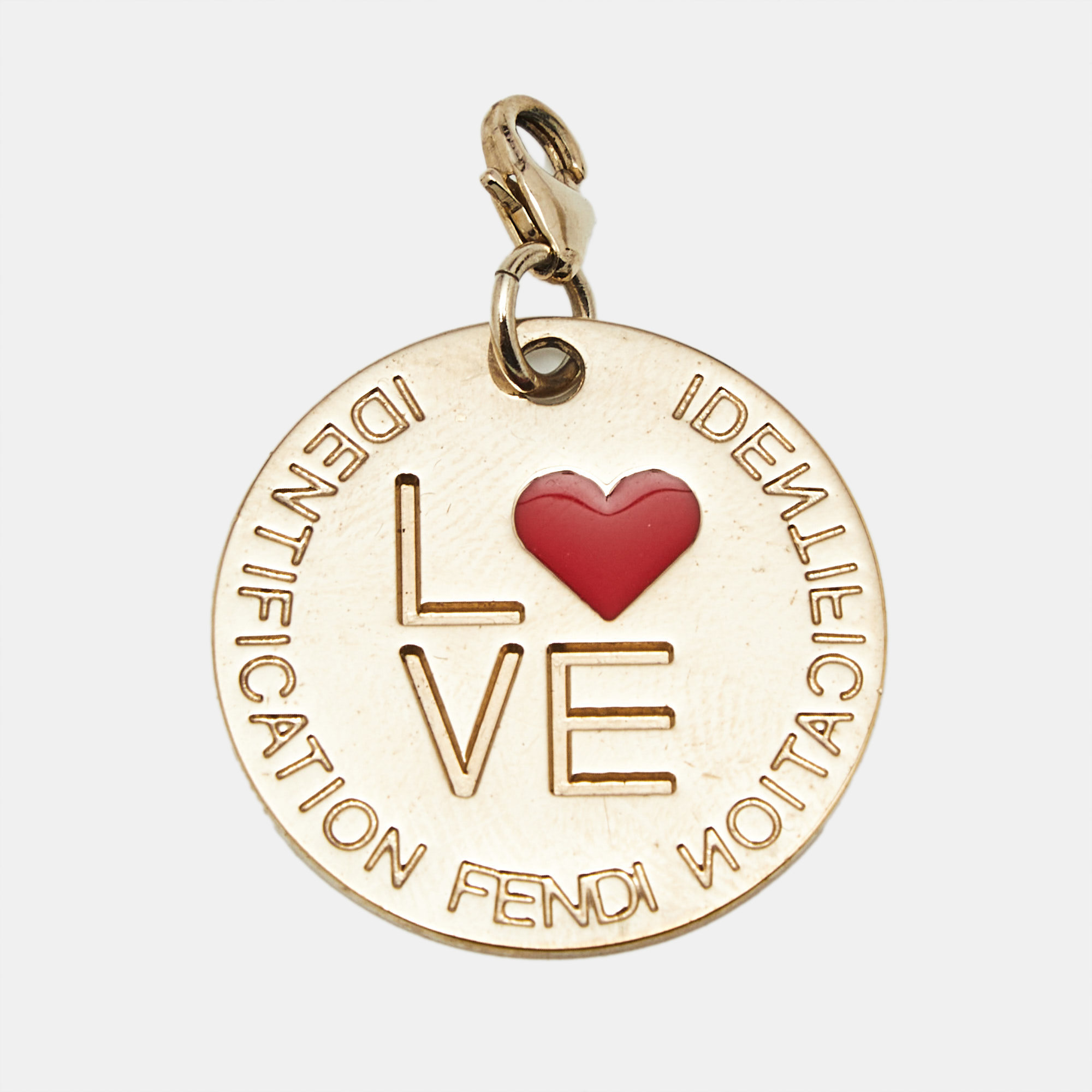 This Fendi Identification charm features a sleek enamel design with the word “Love,” encapsulating modern romance in an everyday accessory. Crafted with precision, it can be styled on bracelets, necklaces, or key holders, adding a bold yet sophisticated accent to your collection.