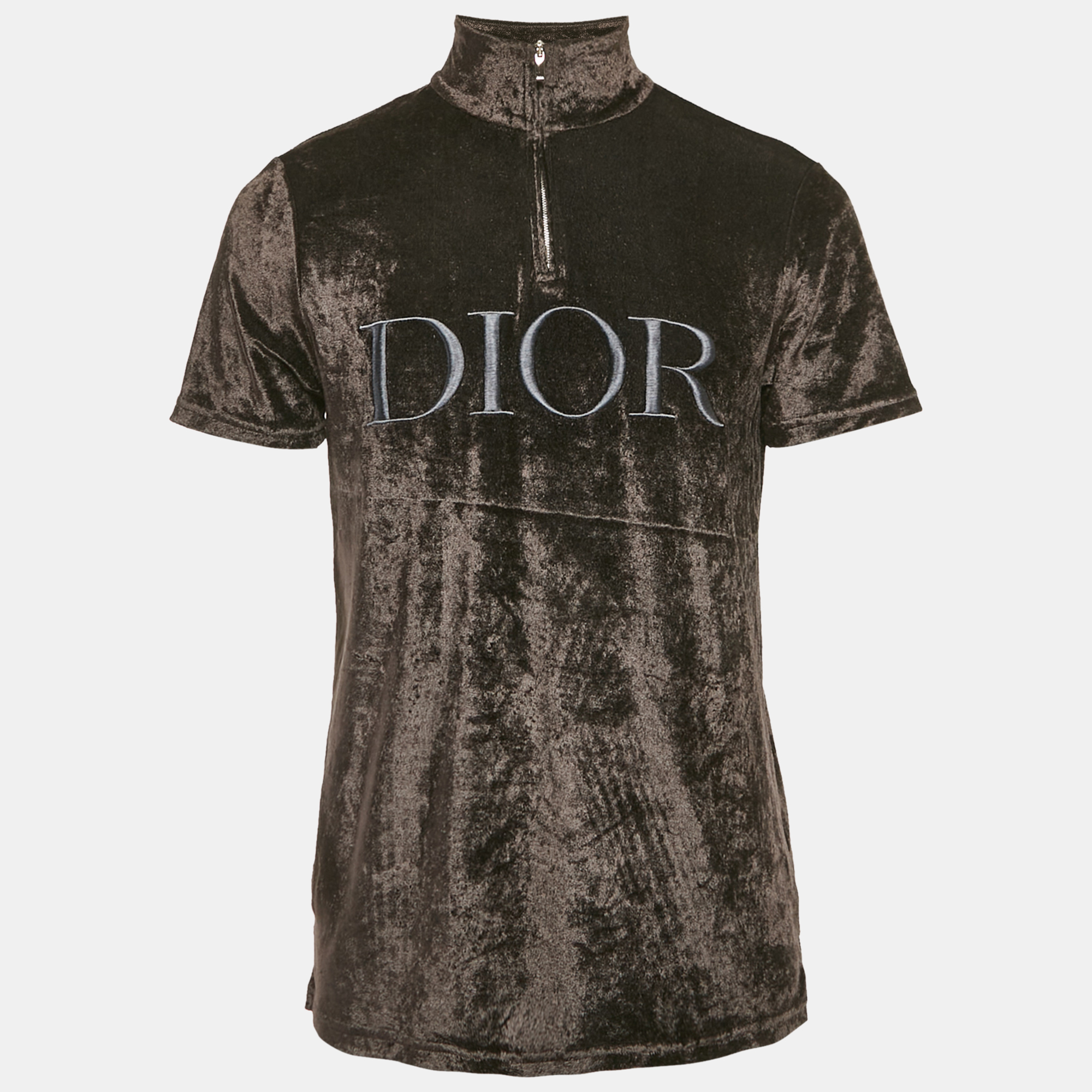 This Dior Homme T shirt is crafted from luxurious black velvet, accented with subtle logo embroidery on the front for a refined finish and a zipper closure at the neck. The plush texture adds depth while maintaining a contemporary silhouette. A standout piece that blends casual comfort with elevated luxury.