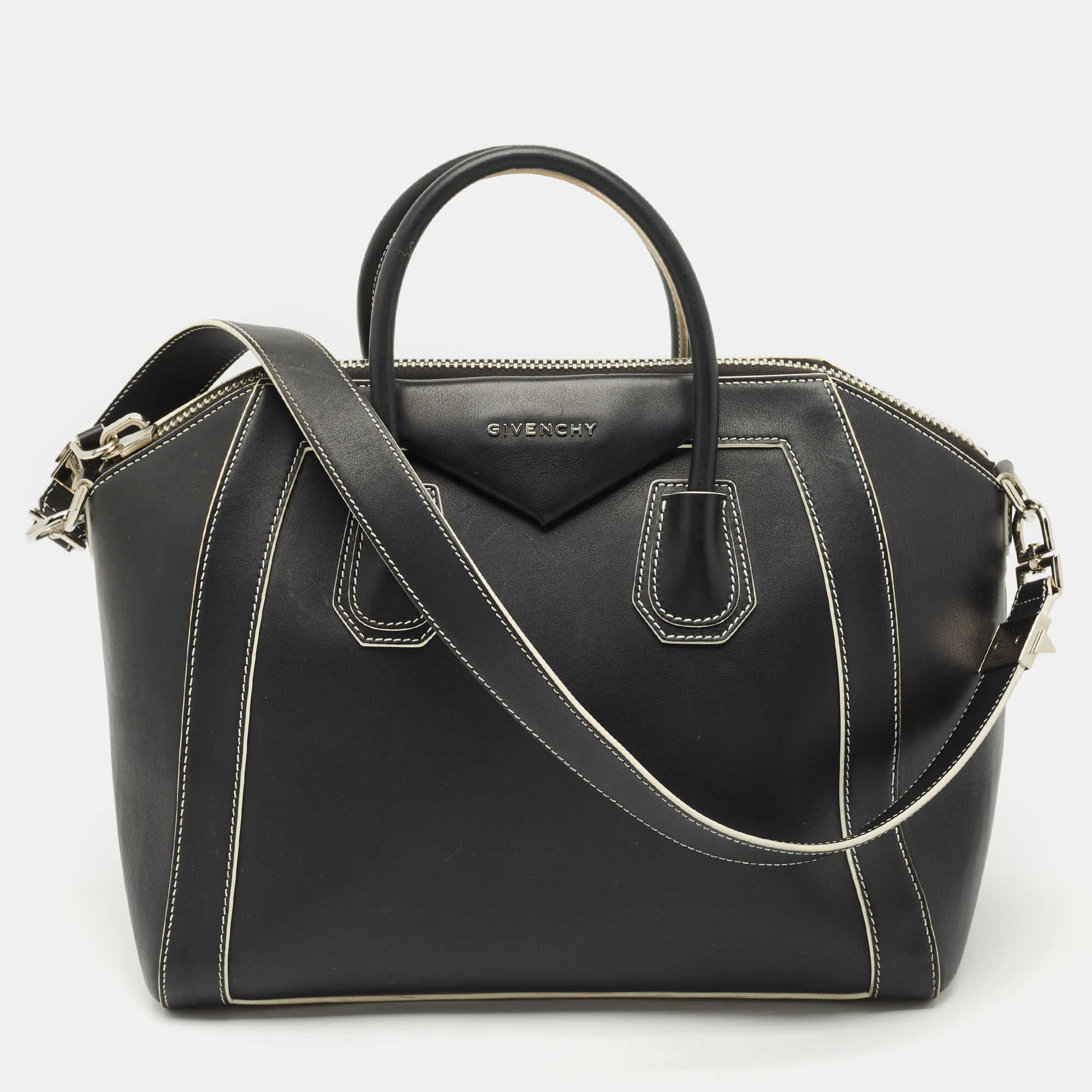 Givenchy’s Antigona satchel in black leather is a modern icon with structured lines and a sleek profile. Roomy yet refined, it transitions seamlessly from day to night.