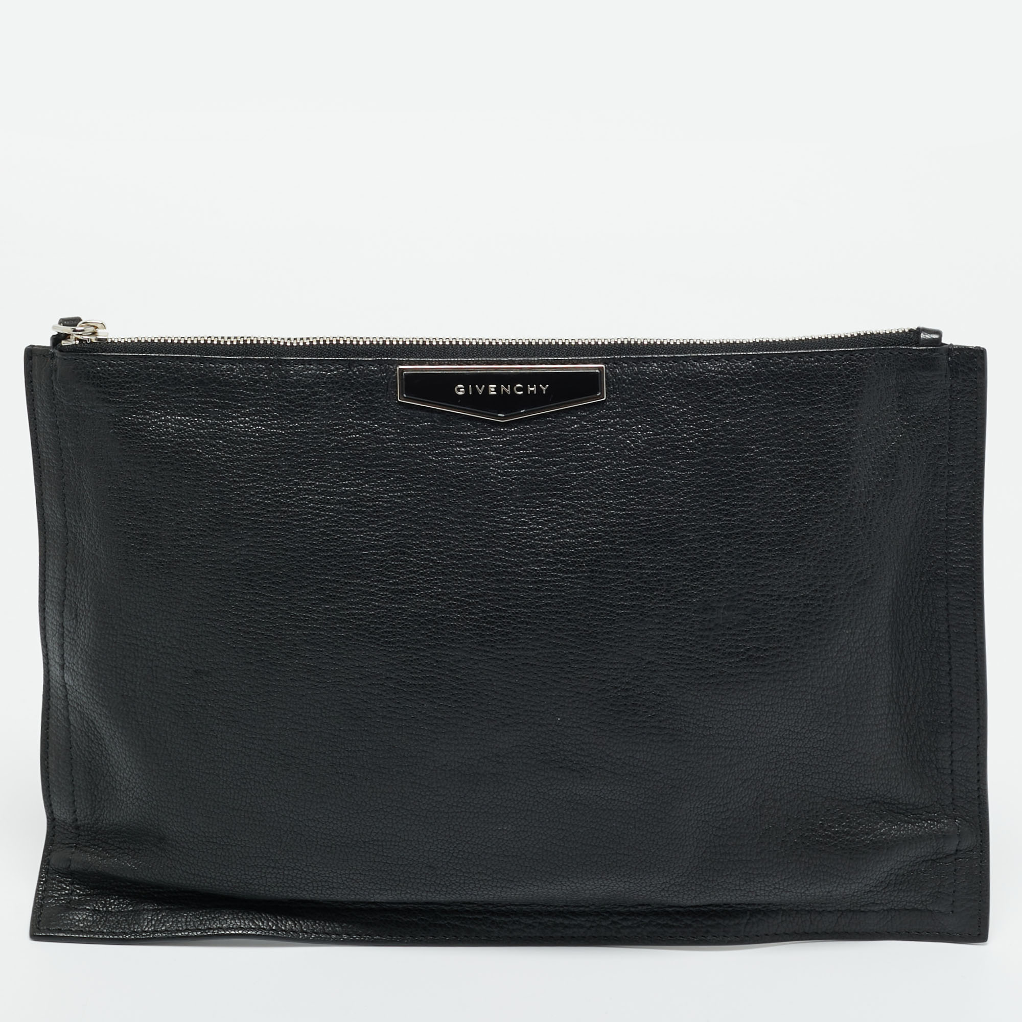 Givenchy’s Antigona flat clutch is crafted in smooth black leather with the iconic logo detail on the front. Its slim profile and zip closure make it a go to piece for tucking under the arm or slipping inside a larger bag.