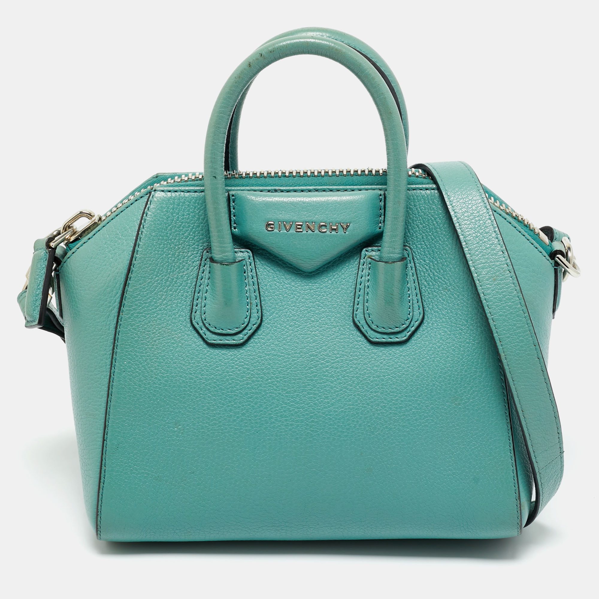 Vibrant and structured, this mini Antigona bag from Givenchy stands out in aqua leather with smooth lines and iconic edge.
