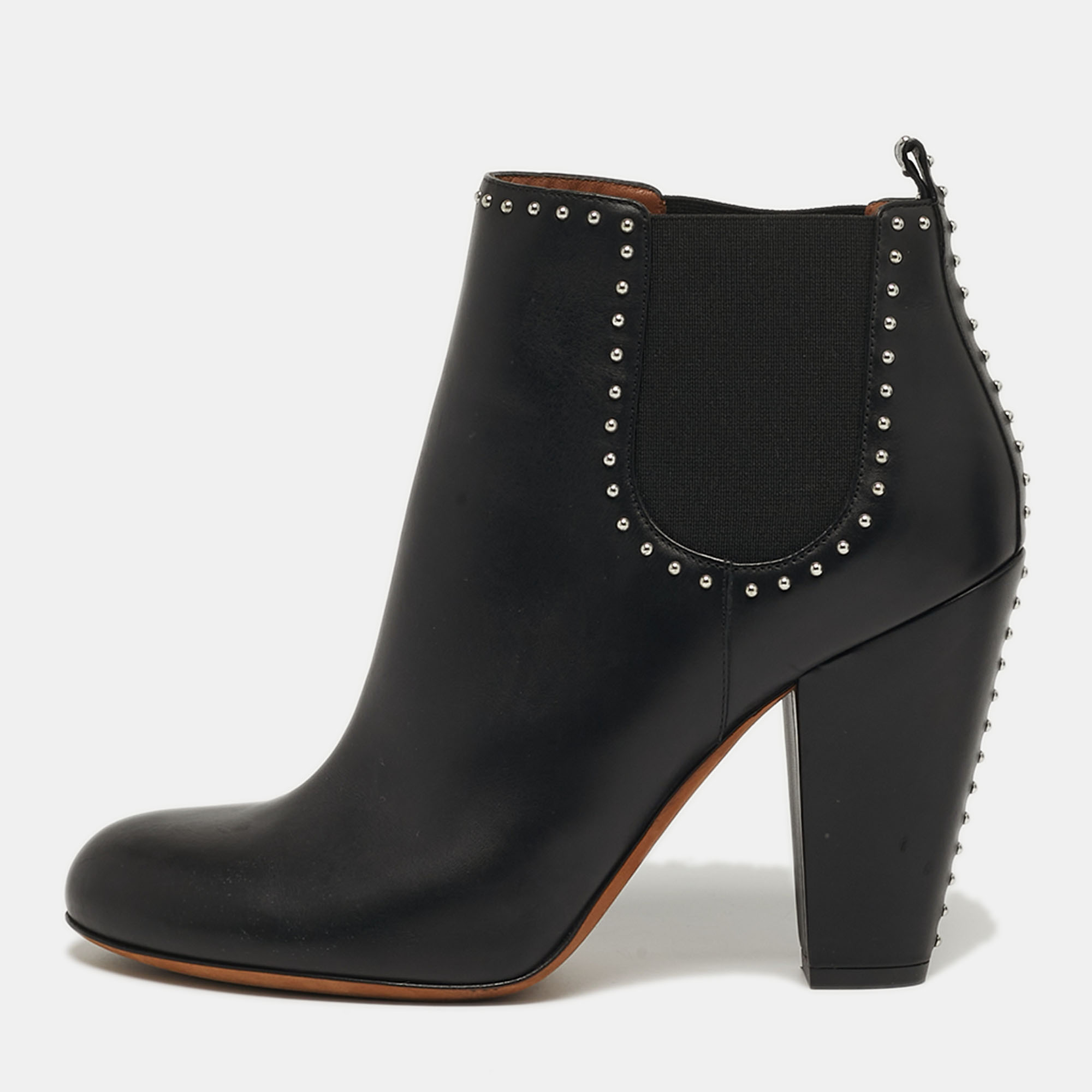 Smooth black leather shapes these Givenchy ankle boots, finished with metal studs tracing the elastic side panels. The round toe and block heel give them a balanced profile suited for regular wear. Designed to pair easily with both tailored and casual looks.