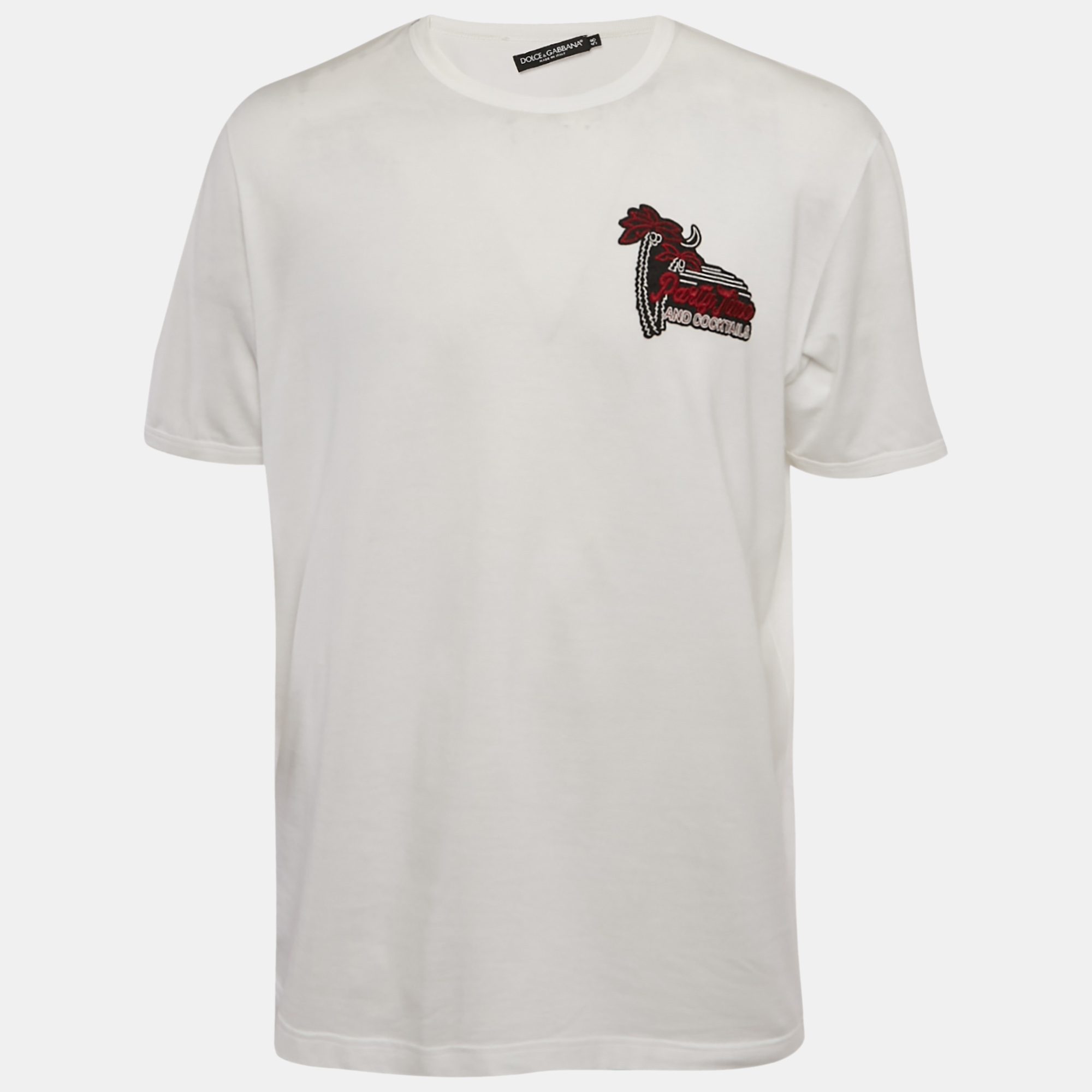This Dolce and Gabbana T shirt brings a touch of craftsmanship with intricate applique detailing on premium white cotton. Designed in a comfortable oversized fit, it blends everyday ease with artistic accents. The textured embellishments elevate it beyond a basic tee. A stylish go to for effortlessly chic, expressive dressing.