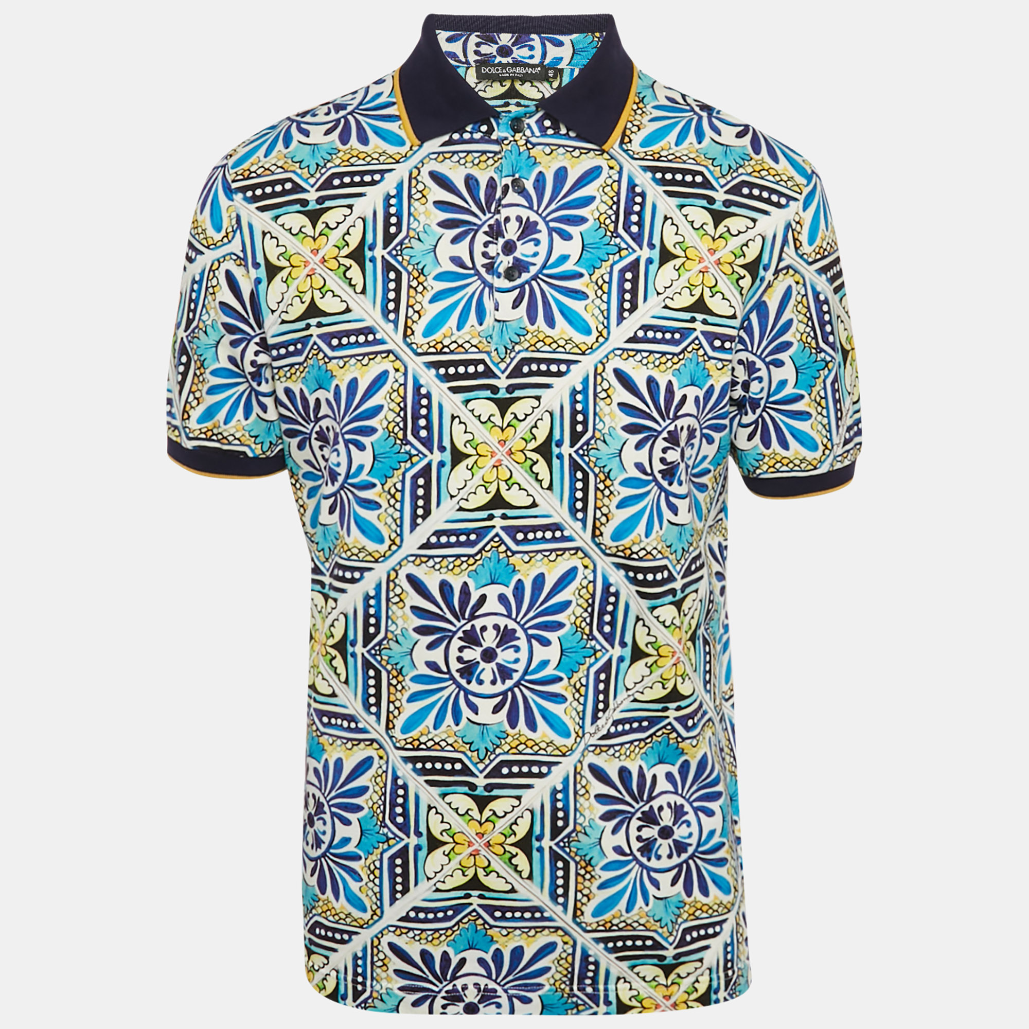 This Dolce and Gabbana polo T shirt is crafted from breathable piqué cotton and adorned with the signature Majolica print. The vibrant blue palette adds Mediterranean inspired character. A statement casual piece that blends heritage design with modern flair.