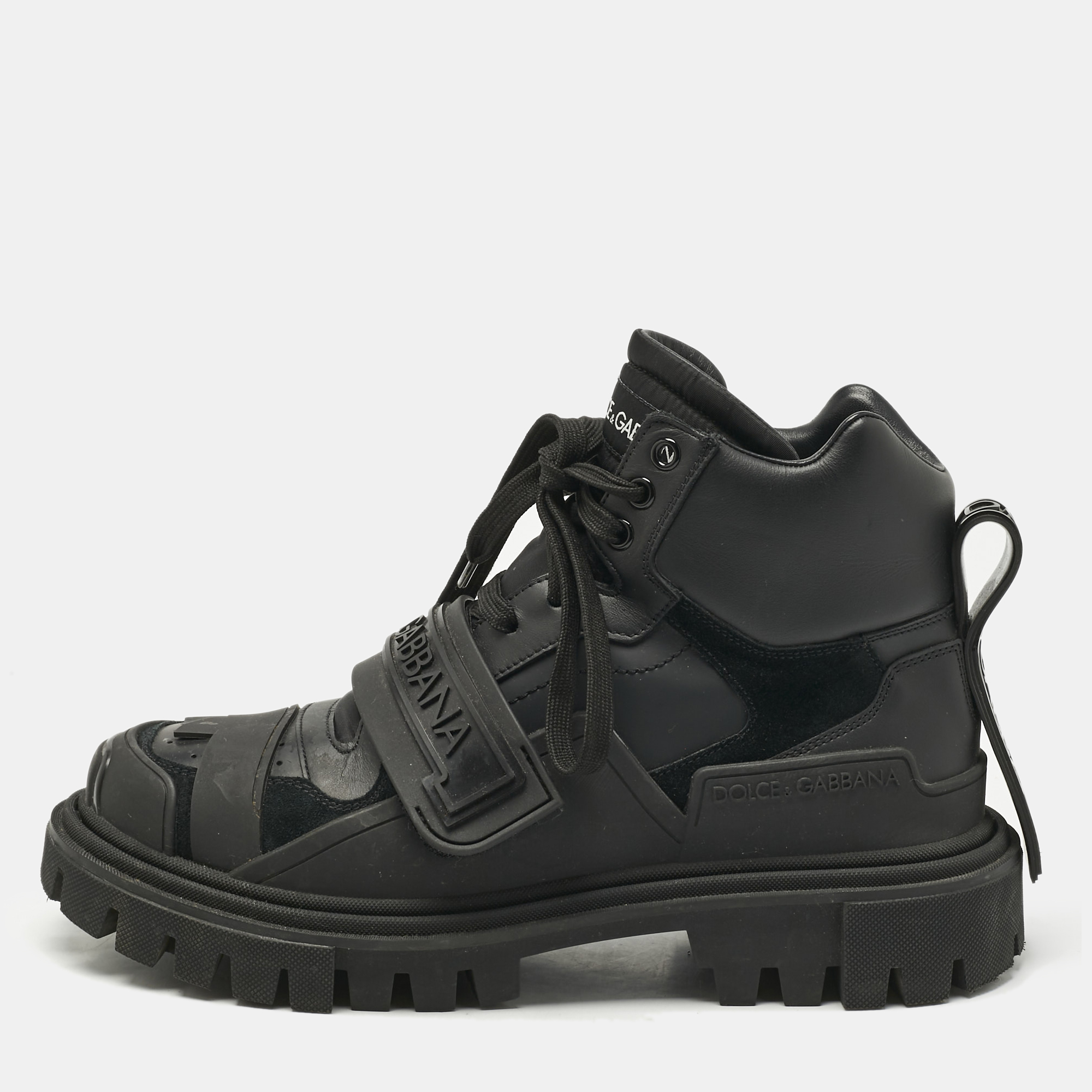 Dolce and Gabbana’s trekking boots feature a bold mix of black leather and chunky rubber with prominent logo straps. Built for statement making comfort, they fuse rugged styling with urban street appeal.