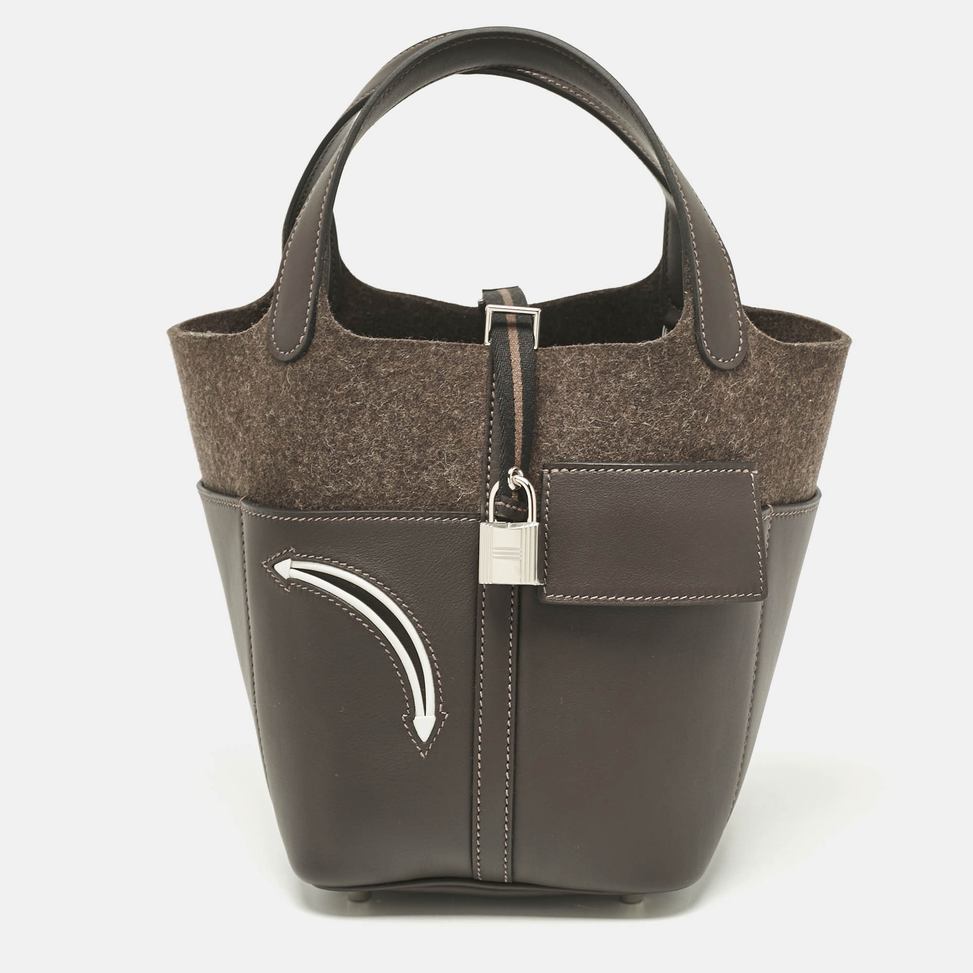 Immerse in sophistication with this exquisite brown handbag, masterfully crafted in France. Merging buttery leather with soft felt, its tactile allure speaks of luxury and refinement. A timeless creation, it showcases the renowned elegance and impeccable craftsmanship. Ideal for the modern woman, this piece whispers exclusivity while the clever Picotin Lock design adds a touch of functional artistry. A harmonious blend of tradition and innovation, this stunning accessory promises to elevate any ensemble.