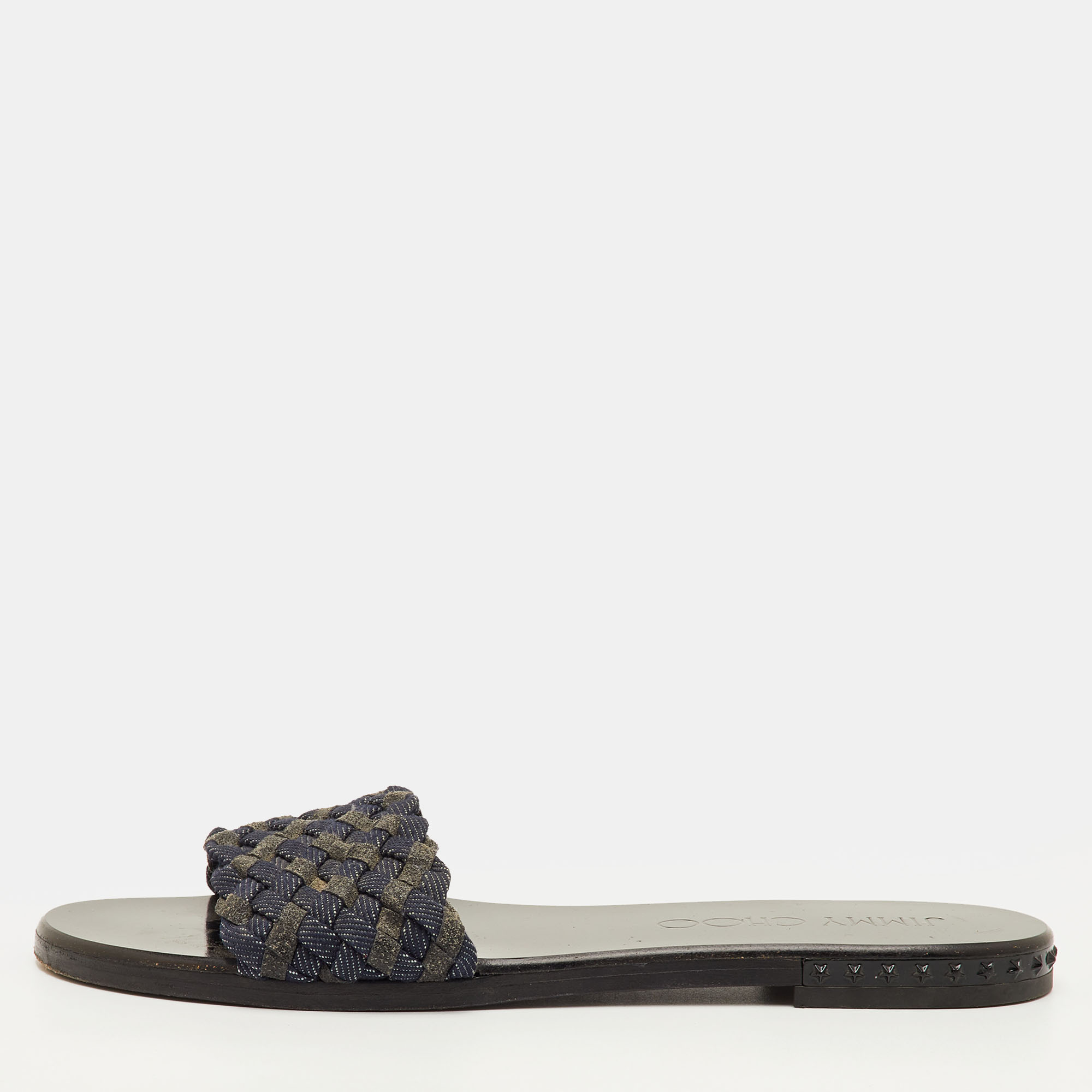 Texture takes the lead in these Jimmy Choo flat slide sandals, woven in a calm mix of navy and grey tones. The open toe design and flat sole offer a relaxed, wearable fit for everyday use.