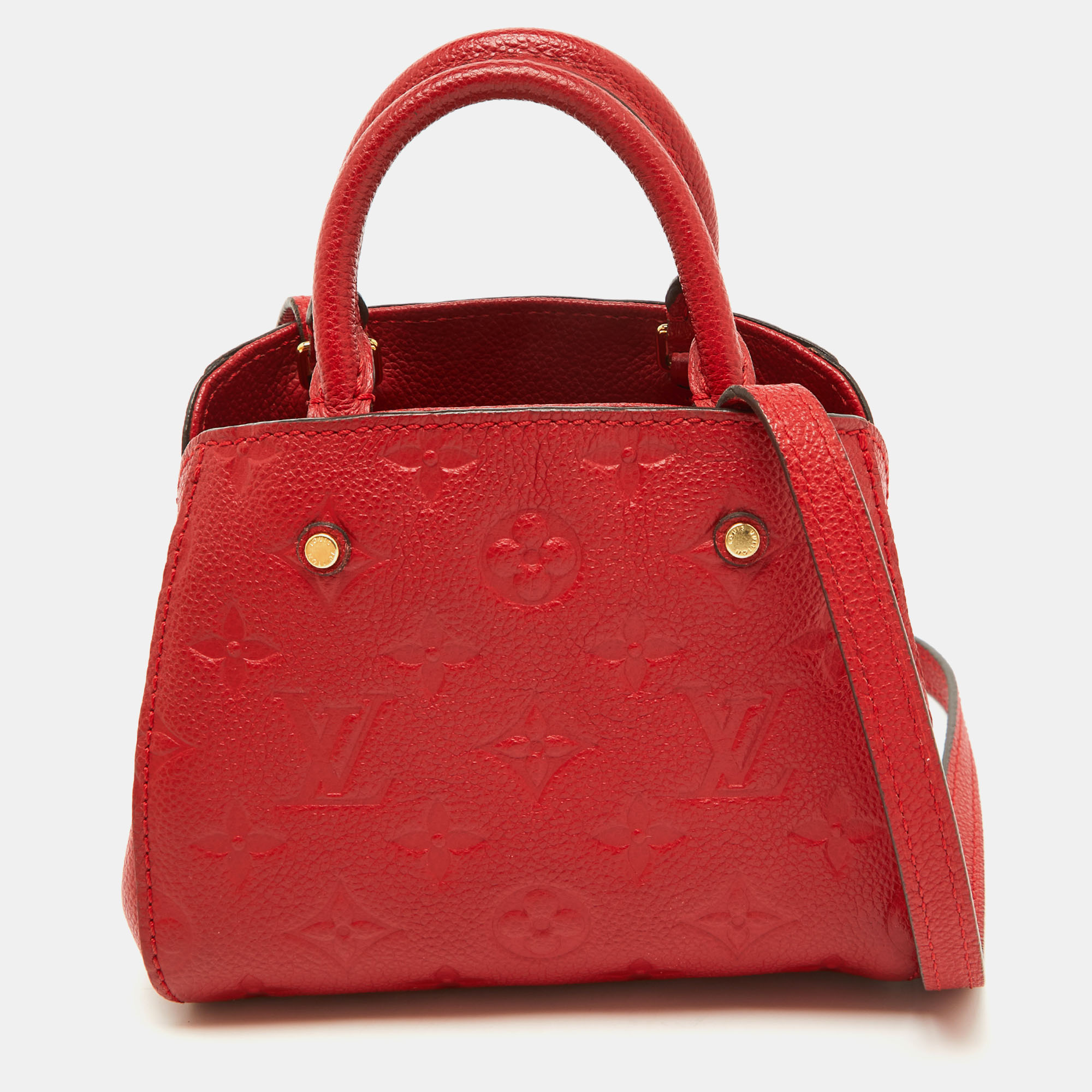 Compact yet luxurious, the Louis Vuitton Montaigne Nano bag is crafted in cherry red Monogram Empreinte leather. With its petite size and elegant gold tone details, it is the perfect accessory for stylish on the go moments.