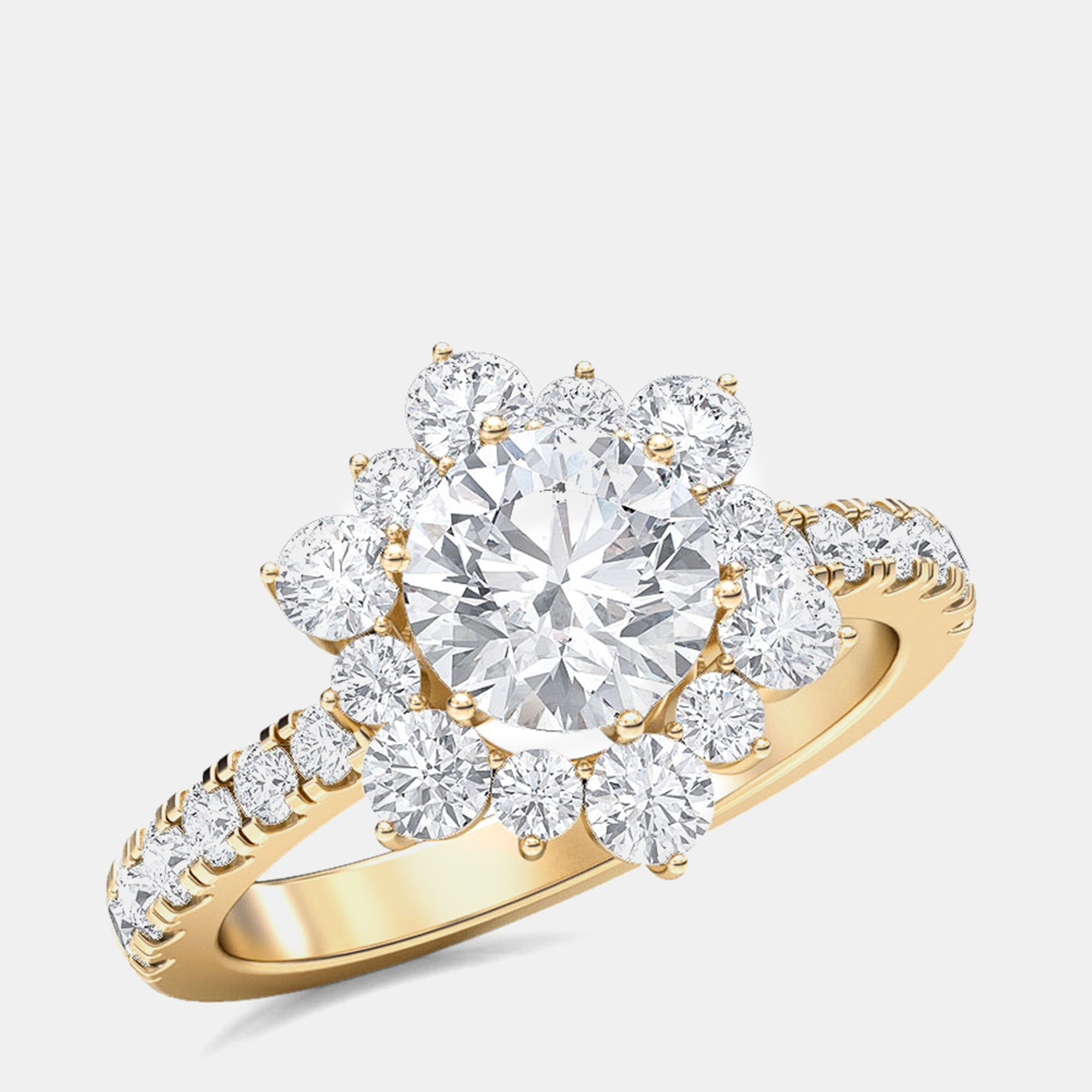 This dazzling ring features a radiant center stone surrounded by a starburst inspired halo. Crafted in 14K gold, it offers a celestial touch to any jewelry collection.