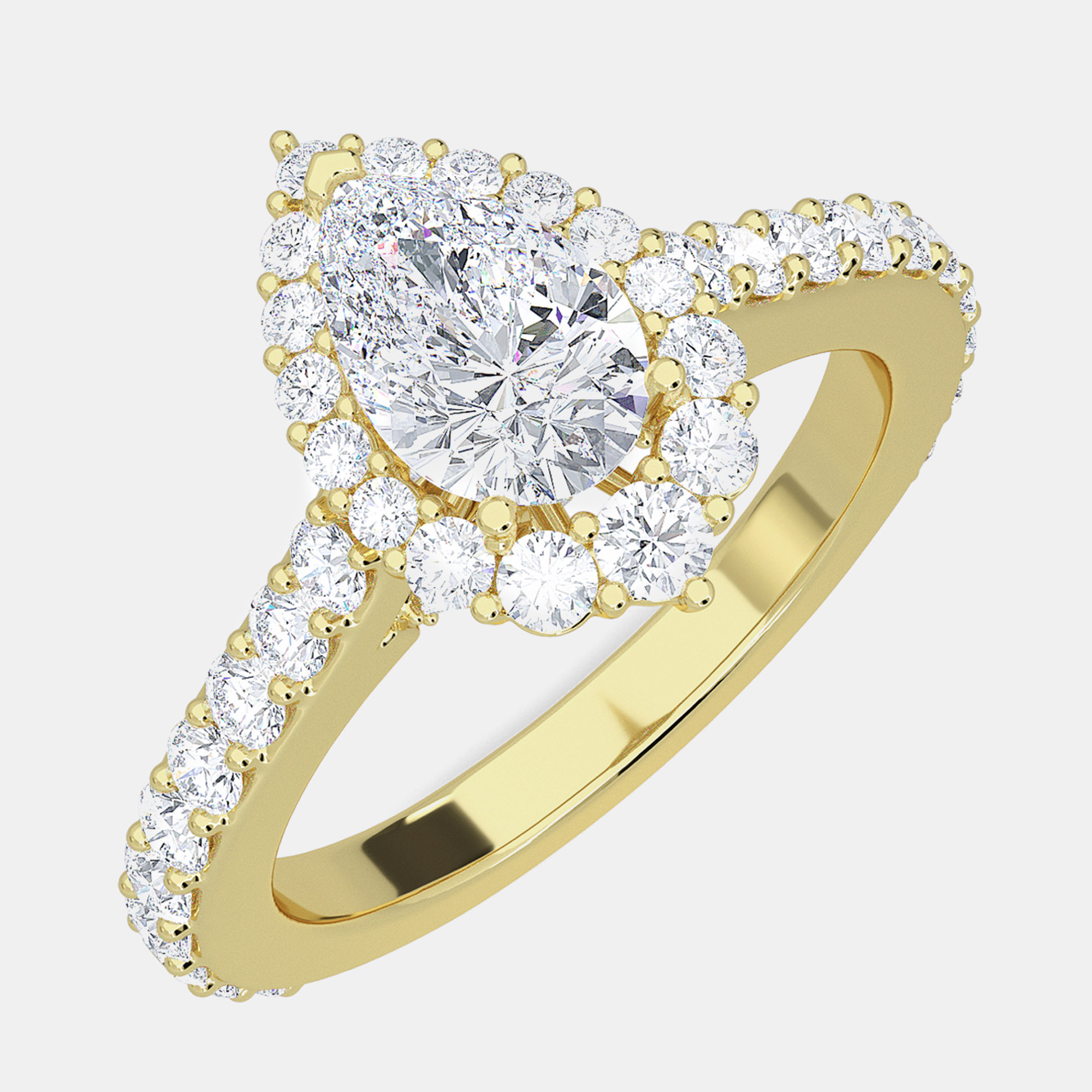A stunning halo of diamonds enhances the brilliance of the center stone, creating a breathtaking engagement ring. Designed in 14K gold, this piece exudes romance and timeless beauty.